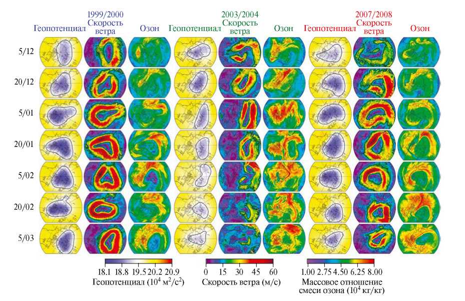Рис. 3. Поля геопотенциала, скорости ветра и массового отношения смеси озона на уровне 50 гПа над Арктикой в период с 5 декабря по 5 марта 1999/2000, 2003/2004 и 2007/2008 гг.