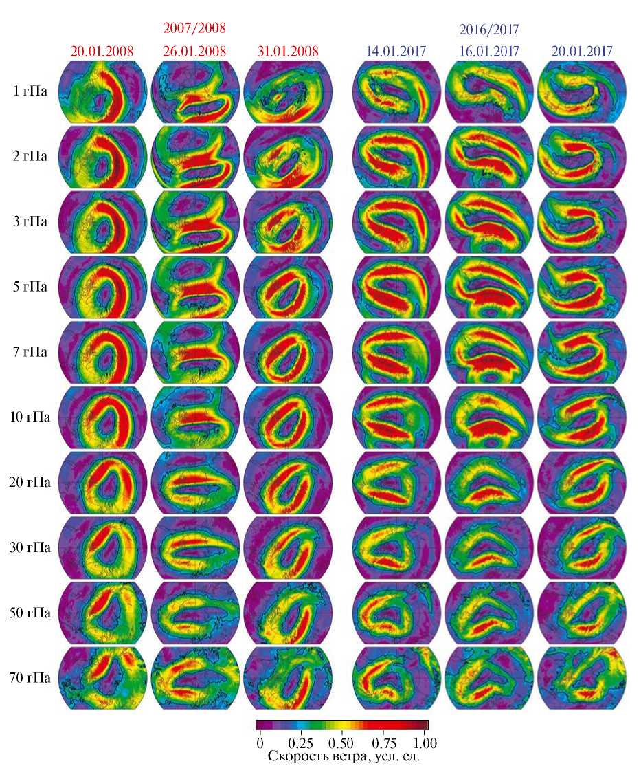Рис. 7. Поля скорости ветра (в условных единицах) на уровнях от 70 до 1 гПа над Арктикой до, во время и после ослабления динамического барьера зимой 2007/2008 и 2016/2017 гг.