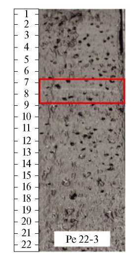Рис. 2. Фрагмент керна донных отложений озера Пеюнгда, глубина в см от границы вода–осадок. Красным выделен слой, маркирующий взрыв ТКТ 1908 г.