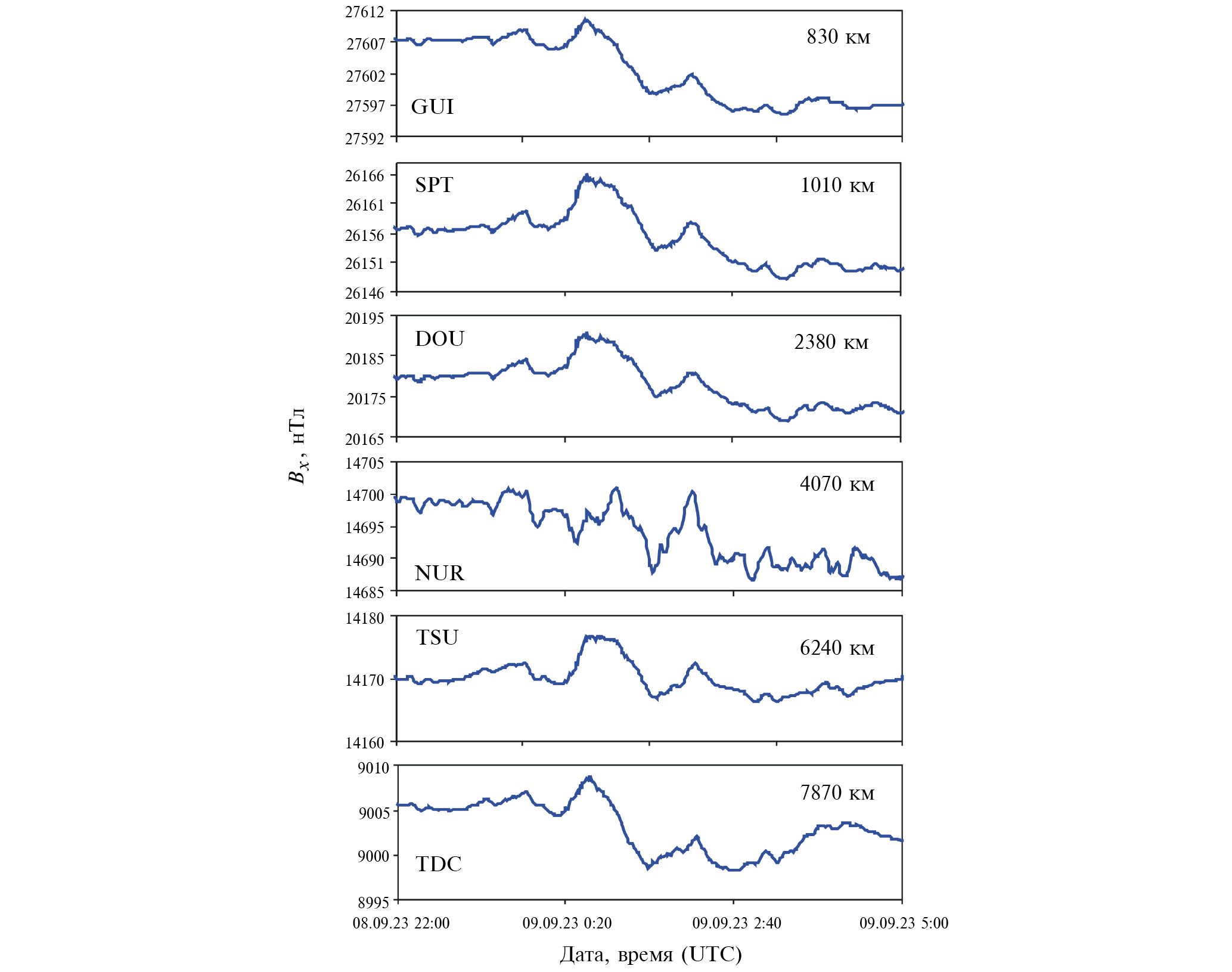 Примеры геомагнитных вариаций, вызванных землетрясениями 08.09.2023 г. и зарегистрированных обсерваториями сети INTERMAGNET, расположенных на разных эпицентральных расстояниях R от очага события, приведены на рис. 2. Из данных рис. 2 следует, что рассматриваемые сейсмические события сопровождались хорошо выраженным магнитным эффектом, представленным в виде трех следующих друг за другом бухтообразных вариаций Вх длительностью от ~50 до ~80 мин и амплитудой от ~1 до ~10 нТл (характеристики каждого из бухтообразных возмущений в виде его максимальной амплитуды Bi и времени ее наступления ti (i = 1, 2, 3) приведены в табл. 2). При этом сходный характер вызванных вариаций магнитного поля наблюдался практически одновременно на всех эпицентральных расстояниях R: от 830 км до ~10000 км. Возмущения фиксируются, начиная с ~23:23 UTC08.09.2023 г., то есть спустя примерно 70 мин после основного толчка события 1 из табл. 1. Первый максимум вызванных вариаций зарегистрирован спустя ~100 мин после первого события, второй и третий – соответственно через ~160 и ~220 мин. Общая длительность возмущенного периода магнитного поля оценивается в ~200 мин.