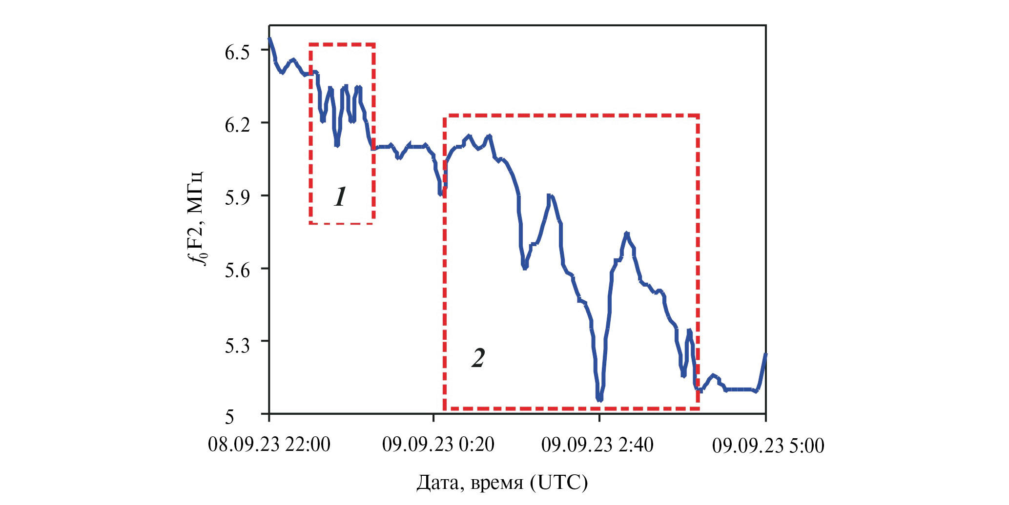 На рис. 3 представлены вариации f0F2 в период землетрясений в Марокко 08.09.2023 г. Из рис. 3 следует, что рассматриваемое событие вызвало ярко выраженные продолжительные знакопеременные вариации критической частоты f0F2 с периодом около 10 мин с ~22:40 до ~23:15 UTC 08.09.2023 г. (максимальная амплитуда вариаций ~0.35 МГц) и с ~00:00 до ~03:10 UTC 09.09.2023 г. с периодом ~ 35– 50 мин (максимальная амплитуда вариаций ~0.9 МГц). Общая продолжительность вариаций критической частоты F2-слоя составила ~4–5 ч. Первое возмущение f0F2 с периодом ~10 мин связано с влиянием на ионосферу Релеевских волн от землетрясений [14]. Второе возмущение f0F2 в виде более длиннопериодного сигнала связано, вероятнее всего, с распространением внутренних гравитационных волн [15].