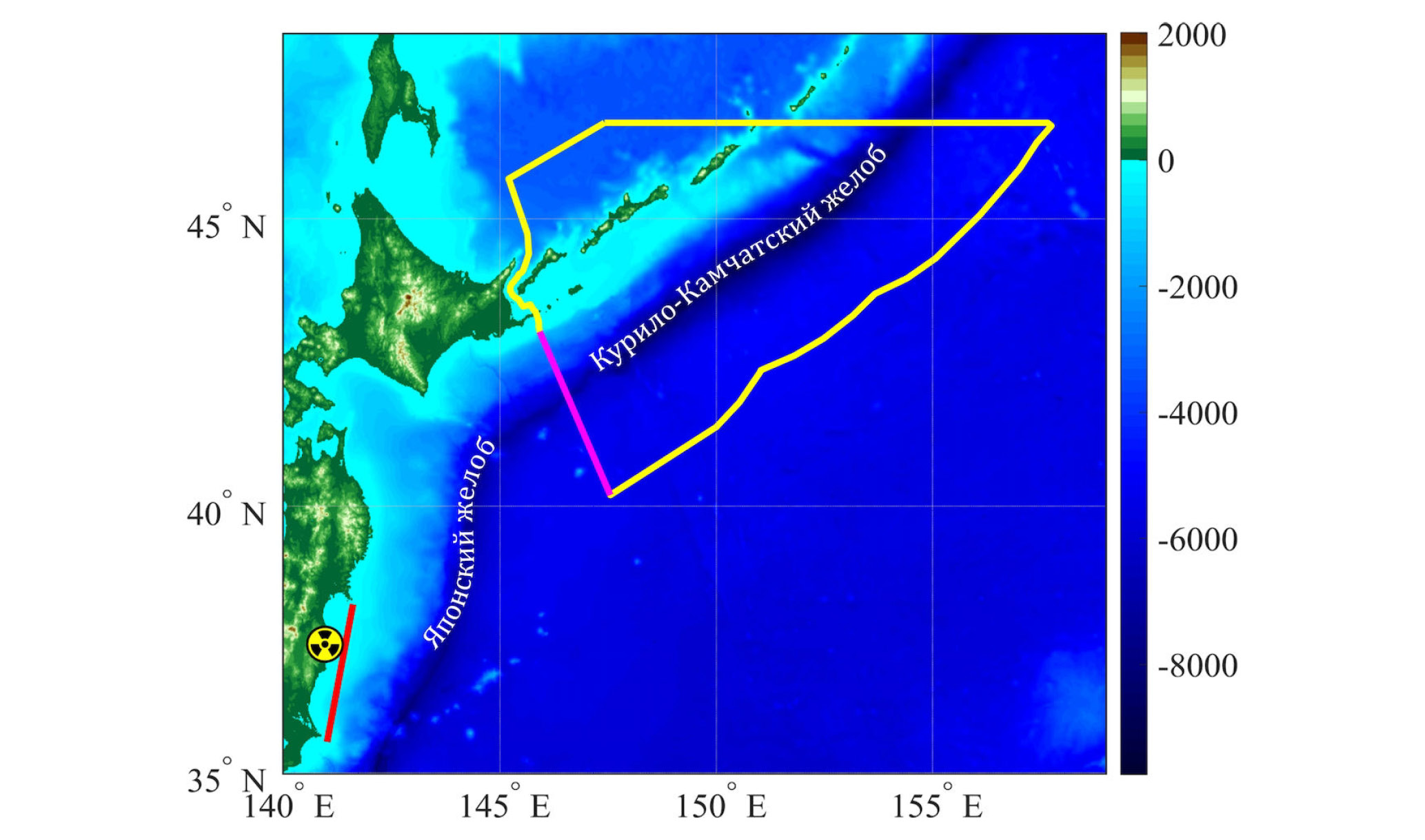 Рис. 1. Район исследования. Расположение АЭС “Фукусима-1” (координаты 37° 25ʹ 12.0ʺ с. ш., 141° 2ʹ 58.0ʺ в. д.) показано знаком радиационной опасности. Желтая линия обозначает границы ЮКРЗ. Розовый отрезок – юго-западная граница ЮКРЗ. Красный отрезок – область запуска (при лагранжевом анализе в прямом времени) и ловли (при лагранжевом анализе в обратном времени) пассивных маркеров, имитирующих загрязнение. Цветом показана топография. Границы рыбопромысловой зоны 61.04 (Южно-Курильская) построены в соответствии с Приложением № 1 Приказа от 21 октября 2013 года № 385 “Об утверждении правил рыболовства для Дальневосточного рыбохозяйственного бассейна”.