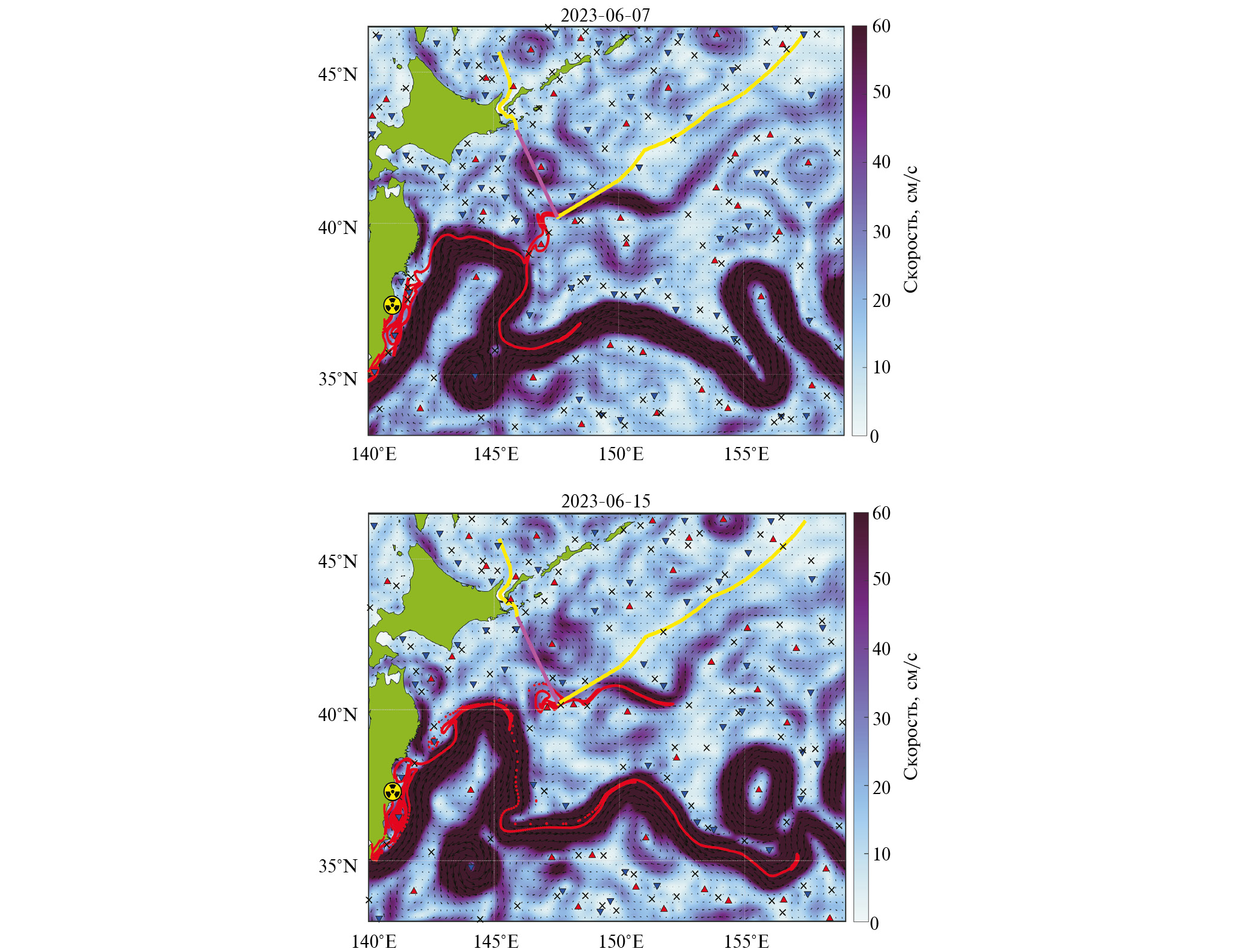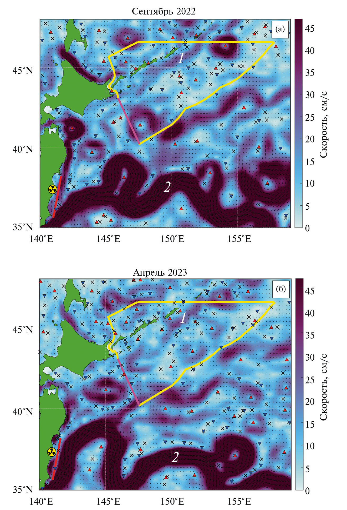 Рис. 2. Геострофические течения, рассчитанные по альтиметрическим данным AVISO и усредненные за сентябрь 2022 г и апрель 2023 г. Течения: 1 – Ойясио, 2 – Куросио. Стрелками показаны векторы течений, цветовая шкала соответствует модулю скорости. Красный отрезок (35.6° с. ш., 141° в. д. – 38.3° с. ш., 141.6° в. д.) расположен вблизи АЭС “Фукусима-1”, от него рассчитываются траектории маркеров. Красные треугольники ▲ соответствуют центрам антициклонов, синие ▼ – циклонов. Черными крестиками показаны гиперболические точки.