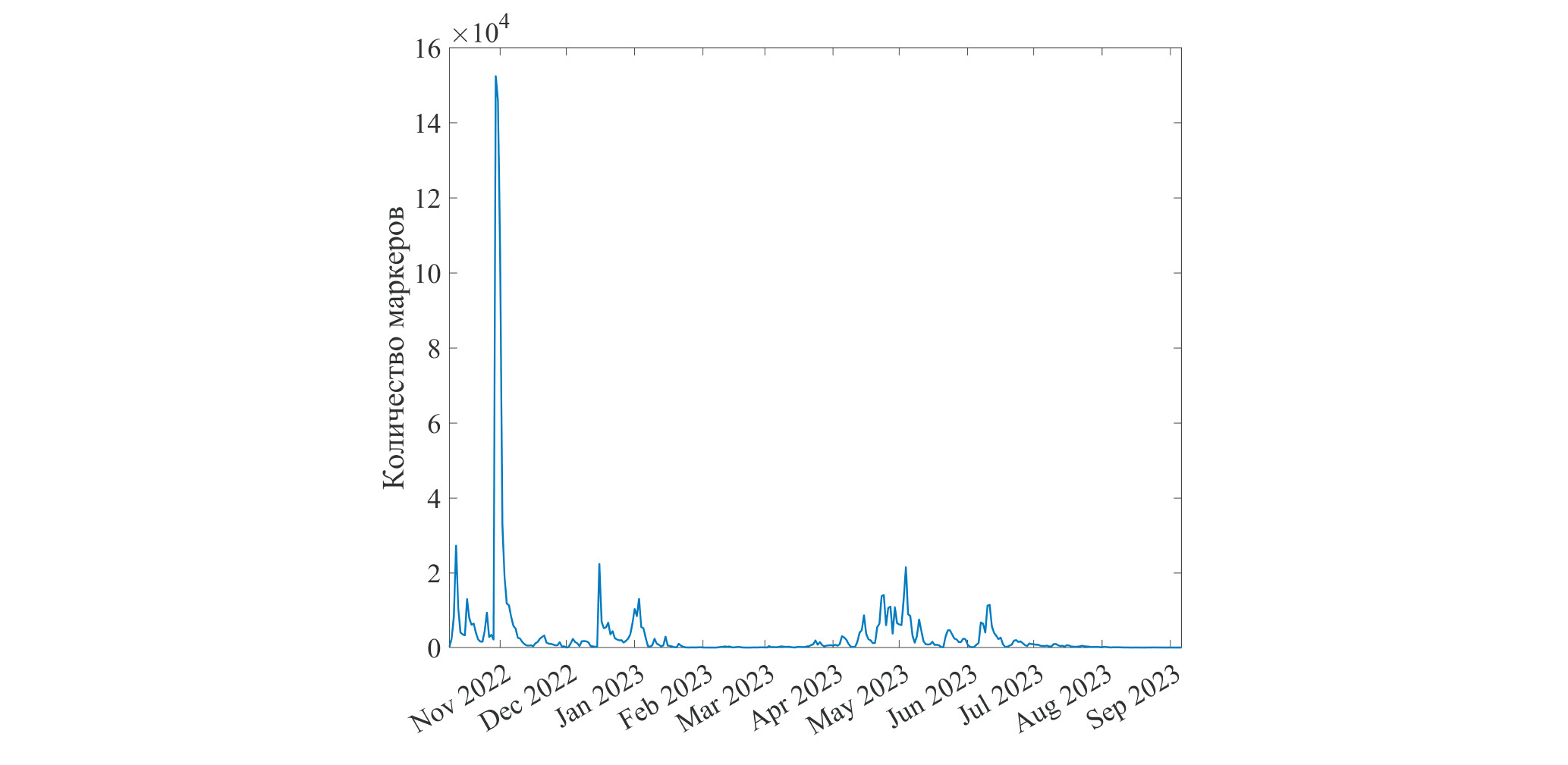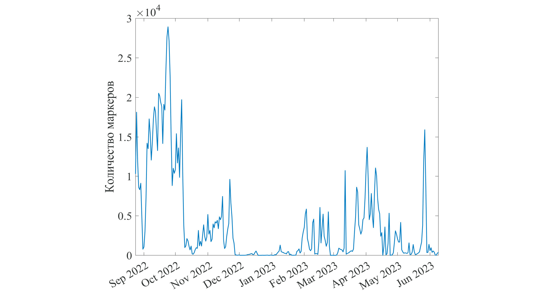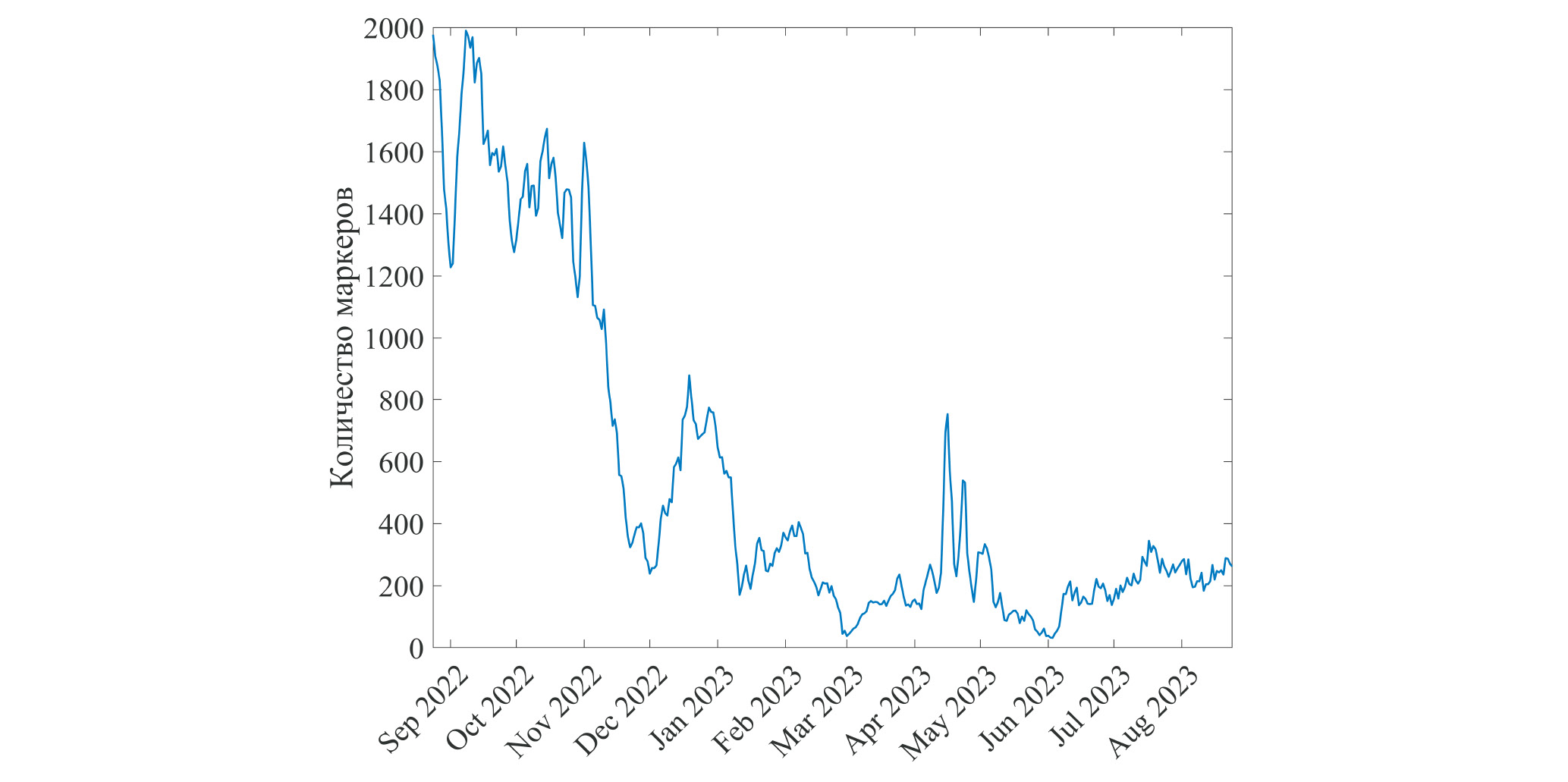 Рис. 4. Временная изменчивость количества “грязных” маркеров внутри ЮКРЗ. Счет проводился ежесуточно с 24 августа 2022 г. по 24 августа 2023 г. Траектория каждого маркера считалась в обратном отсчете времени на 1 год.