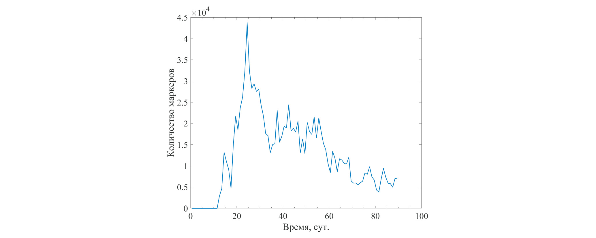 Следующий эксперимент позволяет оценить время, за которое потенциальное загрязнение с АЭС “Фукусима-1” распространяется до юго-западной границы ЮКРЗ (отрезок 40.2° с. ш., 147.55° в. д. – 43.084° с. ш., 145.917° в. д., на рис. 1 показан розовым цветом). Каждые сутки в период с 24 августа 2022 г. по 6 июня 2023 г. на отрезке (35.6° с. ш., 141° в. д. – 38.2° с. ш., 141.6° в. д., на рис. 1 показан красным цветом), расположенном вдоль береговой линии вблизи АЭС “Фукусима-1”, запускались 50000 пассивных трассеров и рассчитывалось время, за которое частицы достигают юго-западной границы ЮКРЗ. Все траектории рассчитывалась в прямом времени на период 90 суток. На рис. 5 видно, что уже спустя 13 сут. после запуска первые “грязные” маркеры пересекают южную границу ЮКРЗ, после чего число “грязных” маркеров резко растет. Максимальное их число, превышающее 4.4 × 104, отмечается на 25 сут., после чего число маркеров в несколько раз снижается, но даже на 90-й день после слива радиоактивной воды их число все еще велико (около 0.7 × 104). Отметим, что в данном эксперименте оценка общего числа маркеров относится не к одной конкретной дате запуска, а ко всем датам рассматриваемого периода.