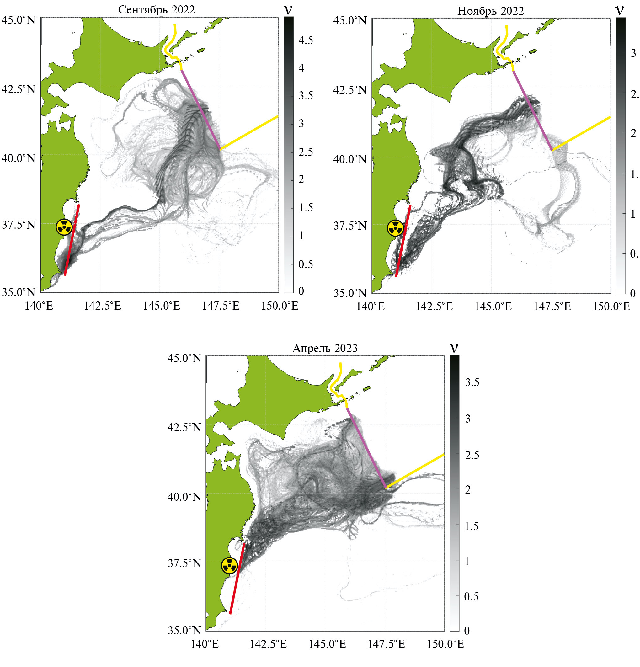 На рис. 8 представлены дазиметрические карты для сентября, ноября 2022 г. и апреля 2023 г., т. е. карты плотности следов (траекторий) “грязных” маркеров, сброшенных с АЭС в различные моменты времени. При построении траекторий исследуемый район 35–44° с. ш., 140–150° в. д. сперва разбивается на равномерную сетку 400×400 прямоугольных ячеек, затем в каждой ячейке считается количество ежесуточных следов, оставленных траекториями загрязненных маркеров, запущенных в определенный период времени у берега Японии (см. красный отрезок на рис. 1) и достигших юго-западной границы ЮКРЗ. Этот метод иллюстрирует транспортные коридоры для “грязных” маркеров (запуск в октябре 2022 г., апреле и мае 2023 г.) Видно, что формы этих транспортных коридоров не похожи друг на друга, так как они зависят от поля течений, которые изменяются во времени. Однако во всех случаях “грязные” маркеры достигают границы ЮКРЗ и впоследствии попадают в район активного рыбного промысла.