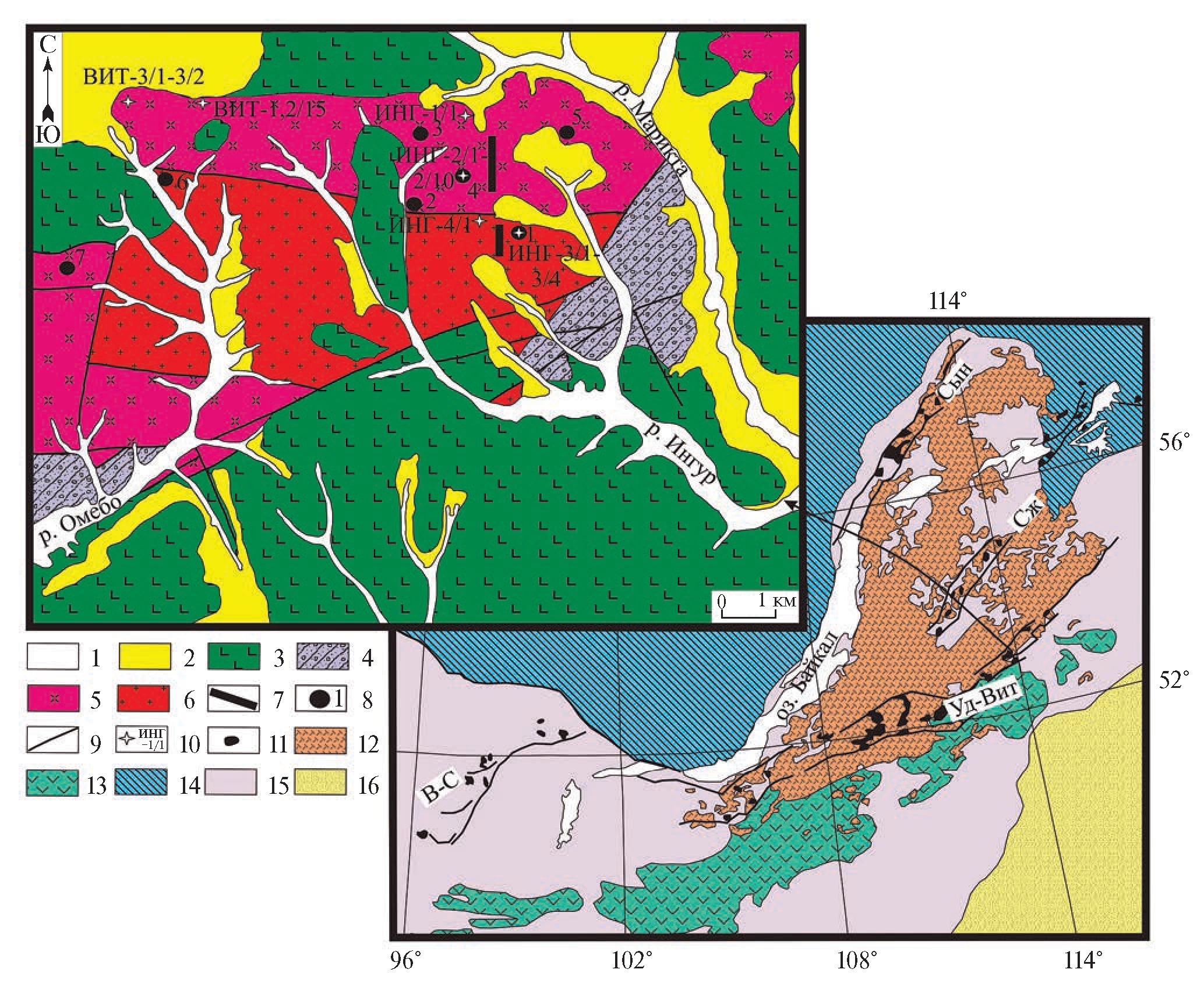 Рис. 1. Схема геологического строения Ингурского массива по [5, 9]. На врезке показано положение района в структурах складчатого обрамления Сибирской платформы. 1 – современные речные отложения: галечники, пески, глины; 2 – четвертичные речные и озерные отложения: галечники, пески, глины; 3 – четвертичные базальты; 4 – раннемеловые отложения, тургинской свиты: конгломераты, гравелиты, песчаники, горючие сланцы; 5–8 – породы Ингурского массива: 5 – щелочные биотит-рибекитовые граниты; 6 – субщелочные биотитовые, аляскитовые и арфведсонитовые граниты, 7 – дайки диабазов, габбро-диоритов; 8 – пегматитовые тела и их номера; 9 – разрывные нарушения; 10 – места отбора проб и их номера; 11–16 – условные к врезке: 11 – массивы щелочных пород и зоны их распространения (Сын – Сыннырская, Уд-Вит – Удино-Витимская, Сж – Сайженская, В-С – Восточно-Саянская; 12 – гранитоиды Ангаро-Витимского батолита; 13 – комплексы позднепалеозойских краевых поясов; 14 – Сибирская платформа; 15 – палеоконтинет; 16 – палеоазиатский океан.