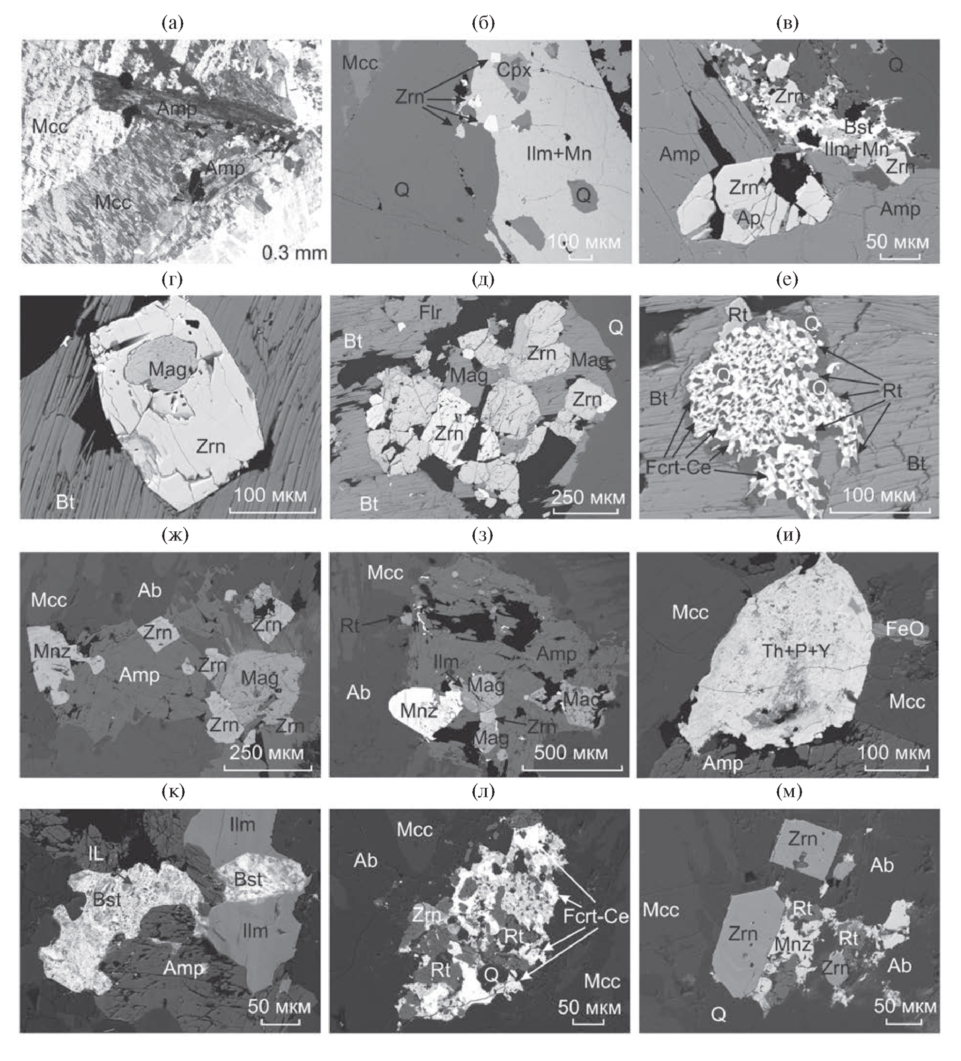 а – биотит-рибекитовые граниты с гипидиоморфнозернистой структурой и идиоморфным амфиболом; б – циркон и ильменит с примесью марганца и включениями кварца и пироксена в гранитах; в – циркон с включением апатита и ильменит с примесью марганца и фторкарбонатом в срастании с амфиболом; г – циркон с включением магнетита в биотите; д – срастание кристаллов магнетита и циркона в биотите; е – графическое срастание рутила, цериевого флюоцерита и кварца в биотите; ж – кристаллы циркона, монацита, магнетита в амфиболе; з – кристаллы магнетита, монацита, ильменита и циркона в амфиболе; и – метамиктный кристалл неизвестного минерала тория с примесью фосфора и иттрия в срастании с амфиболом; к – кристаллы ильменита и полностью распавшегося зерна с примесью Th и REE (предположительно вышеуказанный Th-минерал) в срастании с амфиболом; л – распад неизвестного минерала с образованием цериевого флюоцерита со всеми переходными фазами, а так же рутила и циркона; м – кристаллы циркона, монацита и рутила в альбит-полевошпатовом пегматите.