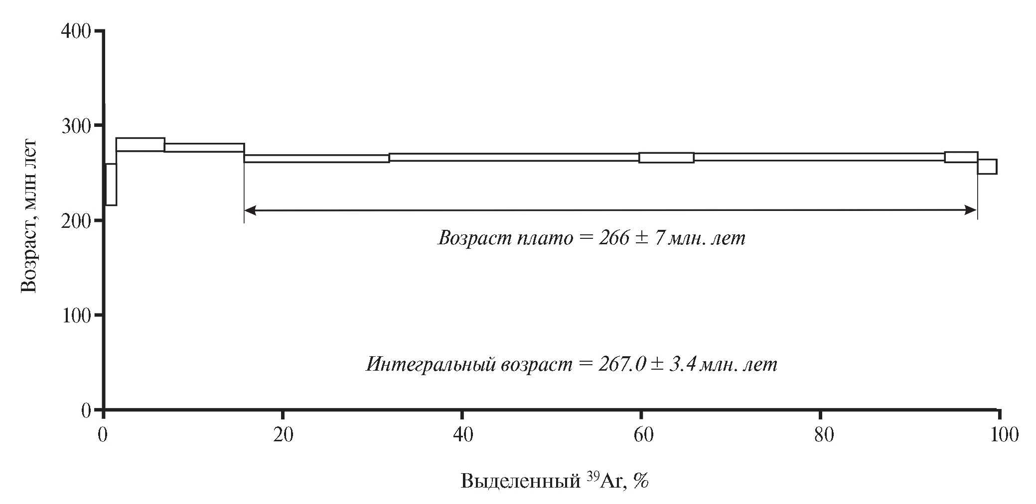 Амфибол ВИТ-3/1, навеска 121.65 мг, J = 0.005042±0.000053*; интегр/возраст = 267.0±3.4 млн лет; возраст плато (825–1050°С, 81% выделенного 39Ar) = 266.0±3.5 млн лет | ||||||||||||||