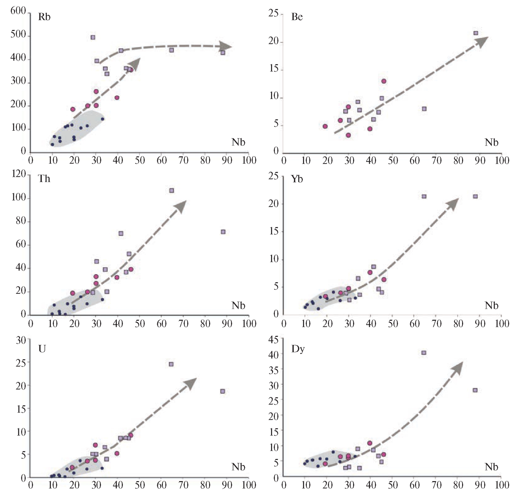 На графике (рис. 6) показано распределение ряда несовместимых элементов относительно Nb, являющегося высоко несовместимым элементом, который обычно используется в качестве индекса дифференциации составов. Отмечаются линейные зависимости, отвечающие пропорциональному росту Rb, Be, Th, U, а также средних и тяжёлых земель (Yb, Dy) с ростом содержания Nb. Наиболее высокие содержания этих элементов отмечаются в пегматитах с рудной минерализацией. Наблюдаемые зависимости для гранитов и пегматитов различаются особенностью распределения точек составов. Особенно выразительно эти различия отмечаются для Rb (рис. 6), но кроме того для Zr и Hf. В отличие от гранитов в пегматитах эти элементы слабо изменяются с ростом содержания Nb, что вероятно связано с их фракционированием из пегматитового расплава в составе полевого шпата и циркона. Несмотря на эти различия, в целом фиксируемые зависимости типичны для магматических систем, эволюция которых регулируется кристаллизационной дифференциацией общего исходного расплава.