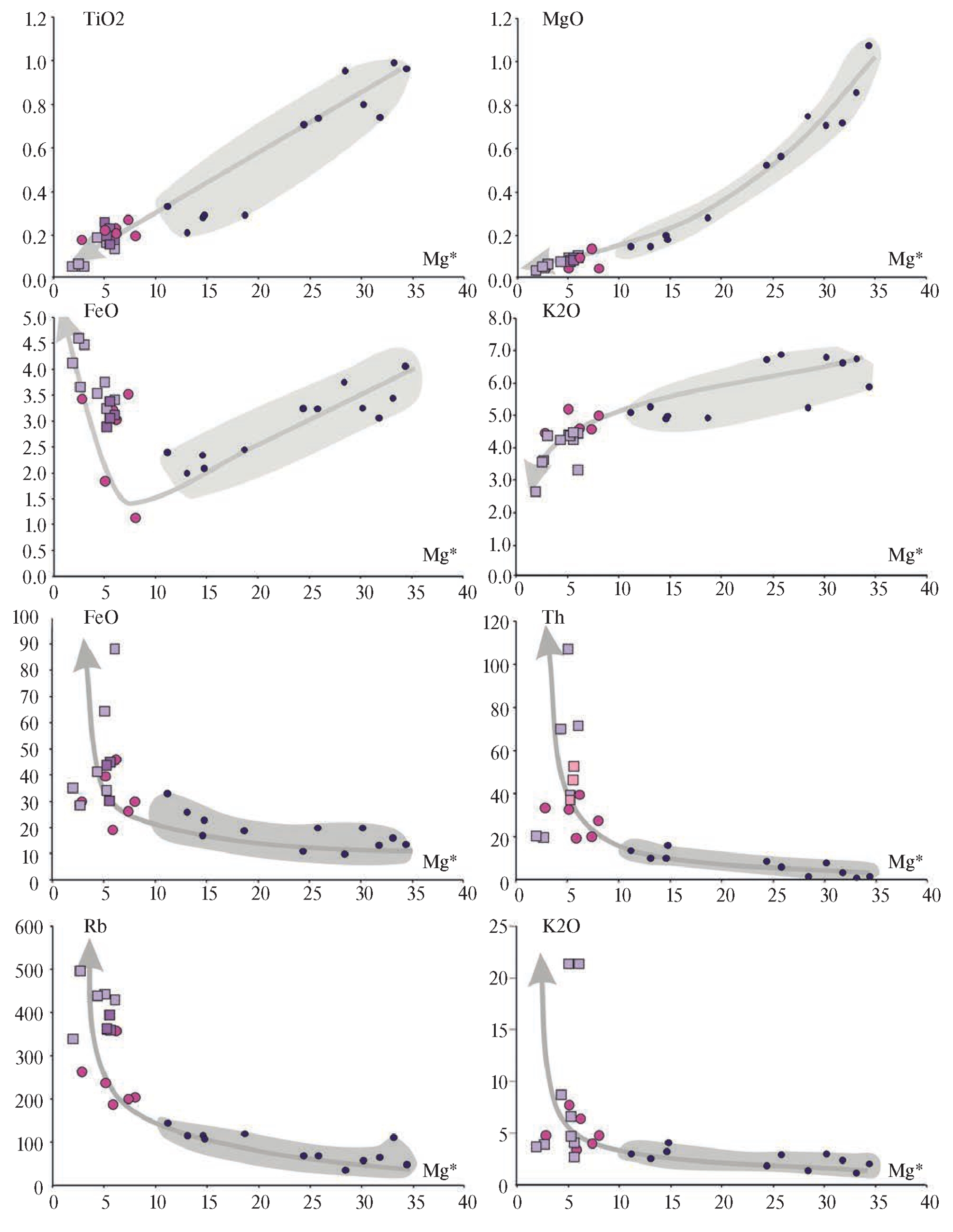 На рис. 7 показано поведение ряда петрогенных окислов и рассеянных элементов в породах обоих массивов относительно величины магнезиальности MgO*, используемой в качестве индекса дифференциации. Их распределение подчиняется общим трендам, при этом магнезиальность пород Шербахтинского массива является более высокой (Mg*>10), чем в породах Ингурского массива (Mg*<1), что указывает на их менее выраженную дифференцированность. Соответственно в первых отмечаются более высокие содержания мафических петрогенных элементов (за исключением FeO) и более низкие содержания несовместимых элементов. Обратная корреляция между FeO и Mg* в породах Ингурского массива характерна для пантеллеритового тренда дифференциации, типичного для глубоко дифференцированных щёлочно-гранитоидных расплавов и обусловленного опережающей кристаллизацией полевых шпатов [13].