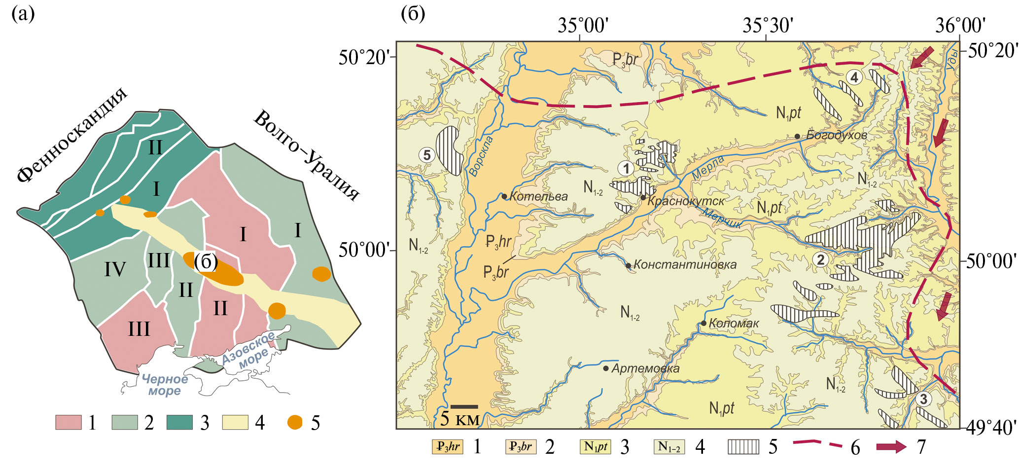 Рис. 1. Карта-схема тектонического расположения (а) и геологического строения (б) Днепровско-Донецкого россыпного района с элементами палеогеографии нижне-миоценового времени. а. Блоки фундамента Сарматии [по 11, 14]: 1– архейского возраста: I – Курский, II – Сумско-Приднепровский, III – Подольский; 2 – палеопротерозойского возраста 2.2–2.0 млрд л.: I – Восточно-Сарматский ороген, II – Ингульско-Севский, III – Росинско-Тичикский, IV – Волынский; 3 – палеопротерозойского возраста 2.0–1.9 млрд л.: I – Осинско-Микашеский магматический пояс, II – Центрально-Белорусская шовная зона; 3 – Припятско-Днепровско-Донецкий авлакоген; 5 – области развития девонского магматизма; б: 1 — харьковская свита, палеоген; 2 — берекская свита, палеоген; 3 – полтавская свита (новопетровская свита), нижний миоцен); 4 — верхний миоцен-нижний плиоцен; 5 — направление сноса титановых и циркониевых минералов; 6 — положение береговой линии в результате трансгрессии Субпаратетиса; 7 — контуры месторождений; 8 — месторождения редкометалльно-титановых руд (1 — Краснокутское, 2 — Мерчикское, 3 — Нововодолажское, 4 — Богодуховское, 5 — Куземинское).