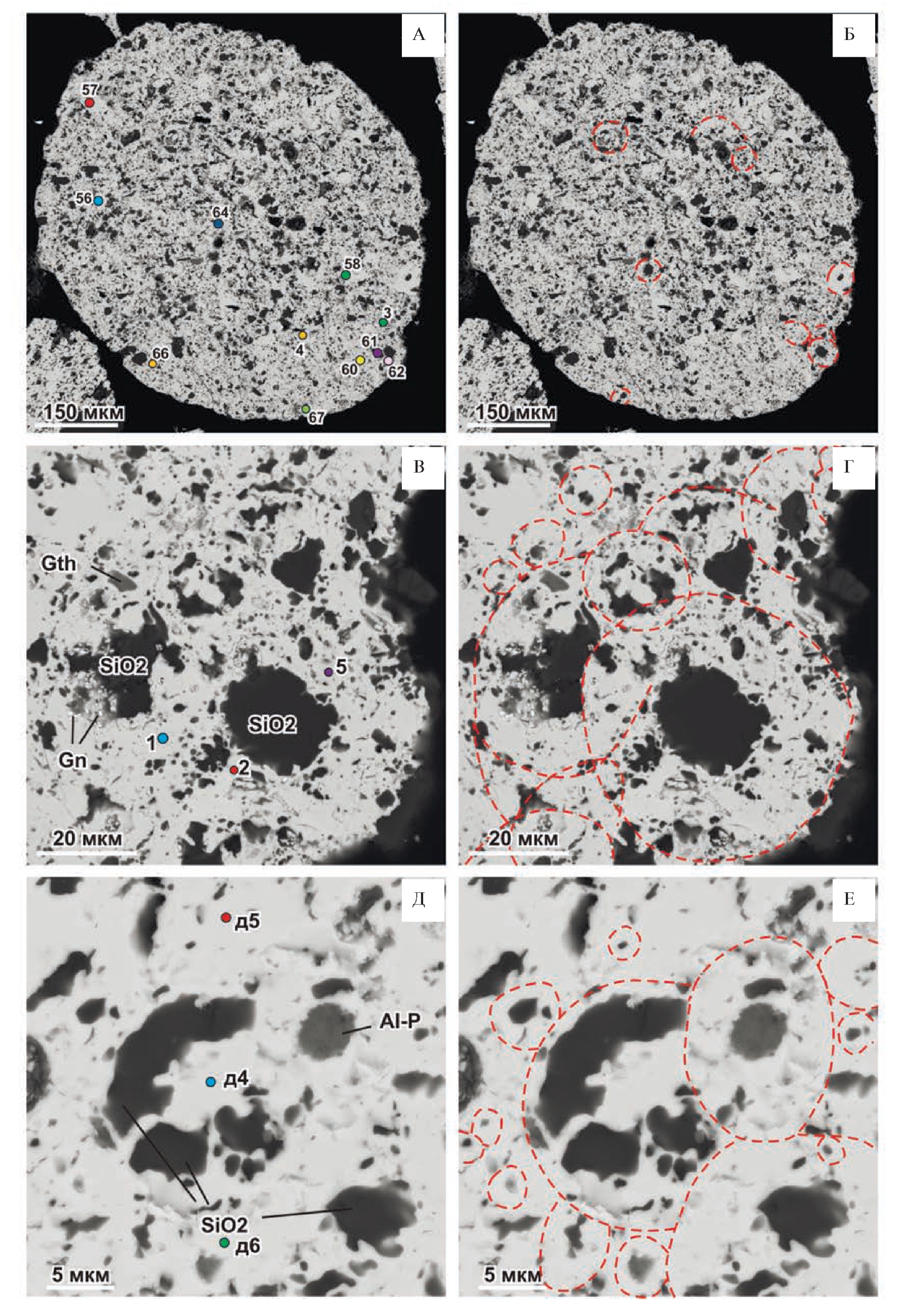 3. Рис. 2. Снимки СЭМ зерна НМ с различной степенью детализации (А, В, Д) и подчеркнутыми бактериоморфными (“стромалитоподобными”) микроструктурами (Б, Г, Е). Белое – монацит; SiO2 – кварц; Gn – галенит; Al-P –флоренсит ((REE)Al3(PO4)2(OH)6; Gth – гётит.