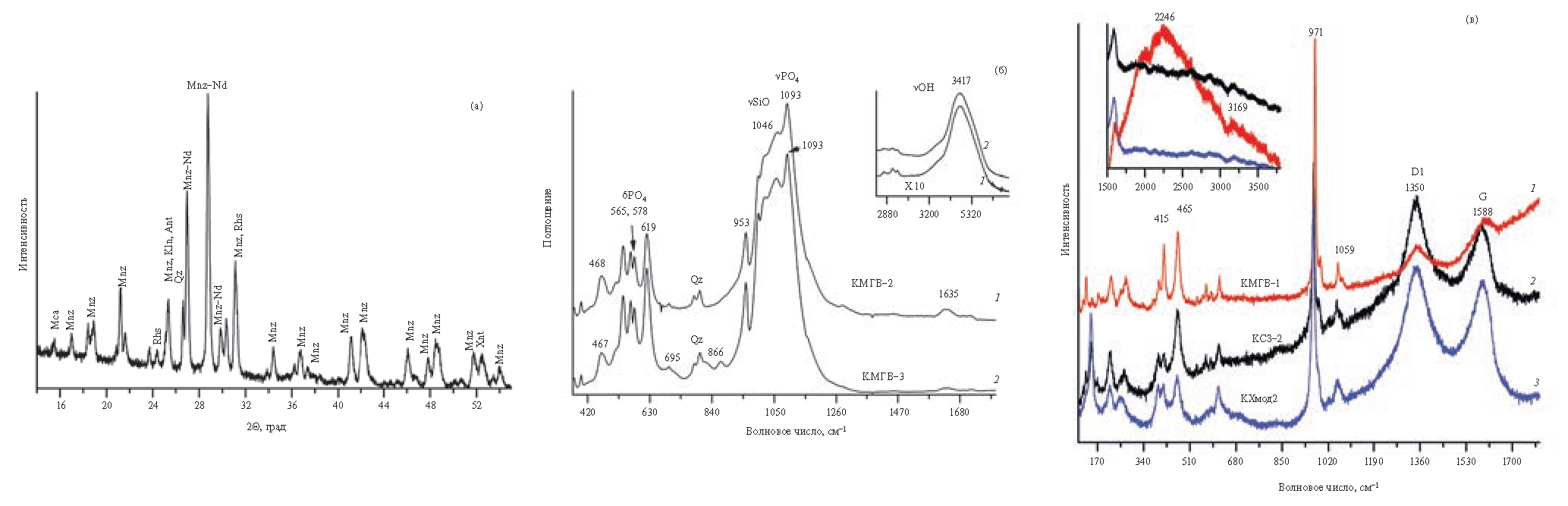 5. Рис. 4. Результаты: a – ПДР (КМГВ-3), Mnz – монацит, Mca – слюда, Qz – кварц, Rhs – родохрозит, Kln – каолинит, Ant – анатаз, Xnt – ксенотим.; б – ИК- (КМГВ-2, КМГВ-3); в – КР-спектроскопии (КМГВ-1, КС3-2, КХМОД2) НМ Куларского хребта. В КР спектрах всех образцов зафиксированы полосы – D1, G разупорядоченного УВ.