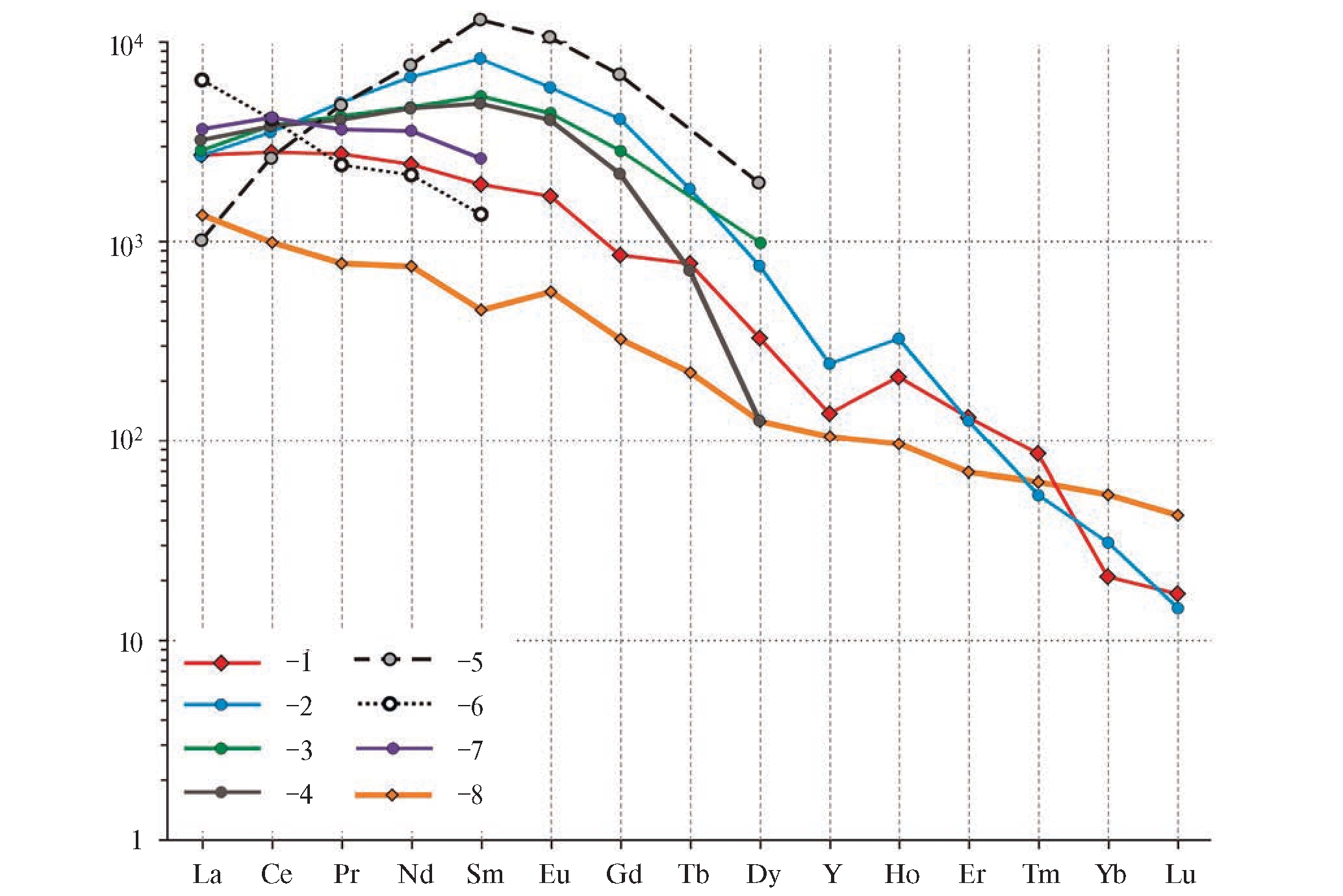 6. Рис. 5. Распределение REE в монацитах и НМ, нормированное на NASC [10, 11]: 1 – Куларский хр. (среднее по НМ табл. 1); 2 – участок Ичетью Средний Тиман (среднее по монацитам [9]; 3 – руч. Ур (среднее по монацитам [4]); 4 – Куларский хр. (настоящее исследование, среднее по данным СЭМ монацитов); 5–7 – руч. Ур, средние по монацитам в различных зонах НМ. 8 – REE в рудах участка Буранный Томторского Nb-REE-месторождения [12].