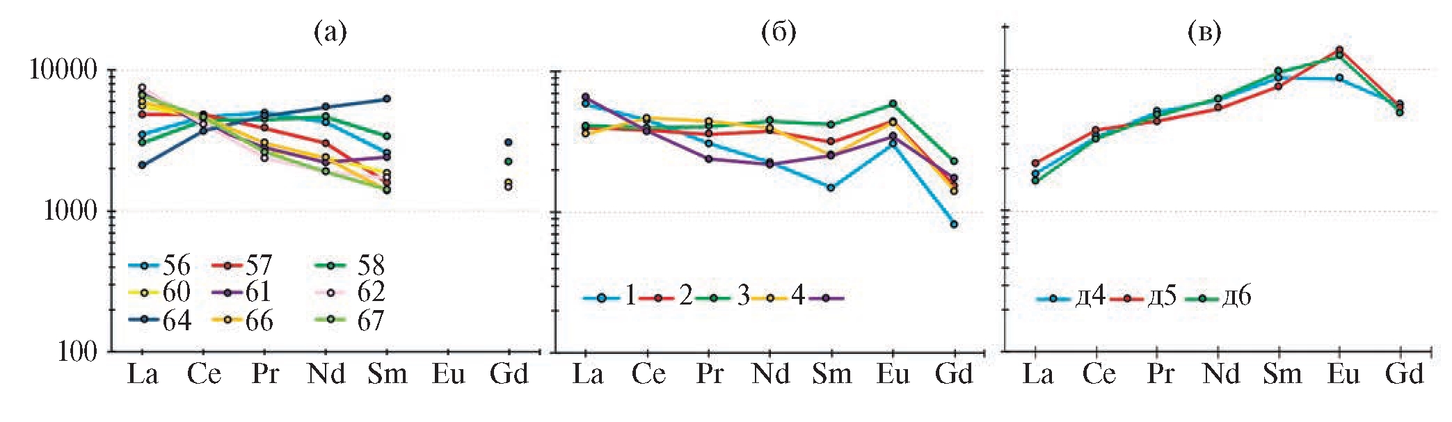 Подобные биоморфные образования, замещённые монацитом, ранее были обнаружены в рудах Томторского месторождения [14, 15]. Характер распределения и соотношения REE (обогащение LREE), отсутствие или слабое проявление Ce-аномалии и положительная Eu-аномалия отмечаются как в НМ Куларского хребта, так и в уникально богатых рудах участков Буранный и Южный Томторского месторождения (рис. 5). Ранее было сделано предположение, что источником REE для формирования НМ в углеродистых отложениях Куларского хребта могли быть породы и руды массива Томтор [4].