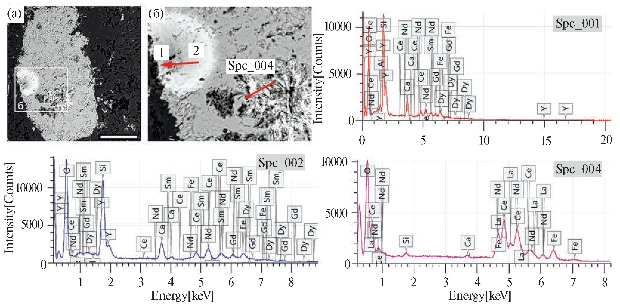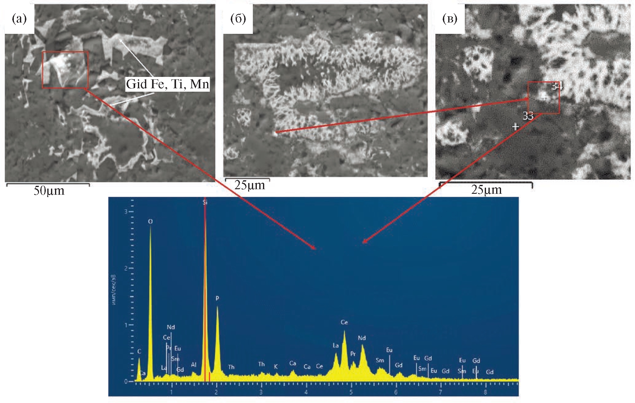 Химический состав округлых концентрически-зональных выделений REE на краю кристалла Ti-магнетита (мас.%): 1 (Spc_001) – в центре: Al2O3 – 3.3, SiO2 – 40.2, CaO – 7.3, FeO – 4.7, Y2O3 – 16.7, Ce2O3 – 7.4, Nd2O3 – 8, Sm3O3 – 3.3, Gd2O3 – 4.4, Dy2O3 – 4.7; 2 (Spc_002) – на краю: SiO2 – 39.3, CaO – 7.7, FeO – 5.7, Y2O3 – 7.13, Ce2O3 – 10.2, Nd2O3 – 12.7, Sm3O3 – 6.31, Gd2O3 – 6.9, Dy2O3 – 4.4.
