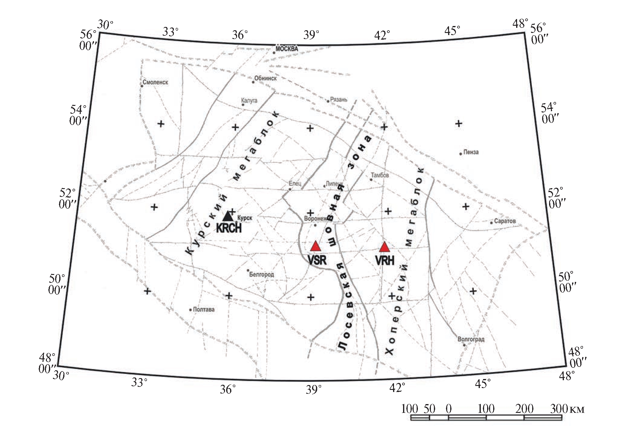 На территории ВКМ, начиная с октября 2017 года открыты и действуют две широкополосные сейсмические станции Единой геофизической службы РАН (ФИЦ ЕГС РАН) – “Сторожевое” (VSR) и “Новохоперск” (VRH). Сейсмические станции укомплектованы широкополосными сейсмическими датчиками СМ3-ОС с частотным диапазоном 0.02–50 Гц, а также отечественными регистраторами Ugra. Кроме того, в 2023 году ИДГ РАН, совместно с ИФЗ РАН, была открыта новая сейсмическая станция “Курчатов” (KRCH), укомплектованная сейсмическим датчиком Guralp 3T с частотным диапазоном 0.008–50 Гц и регистратором RefTek 130. Как видно из рис. 1, станции покрывают все основные тектонические элементы КМА и анализ их данных позволит провести сравнение строения их литосферы. С учётом недостаточного для накопления кондиционного набора данных времени работы станции KRCH, в представленной работе были использованы только записи станций VSR и VRH с октября 2017 по декабрь 2021.