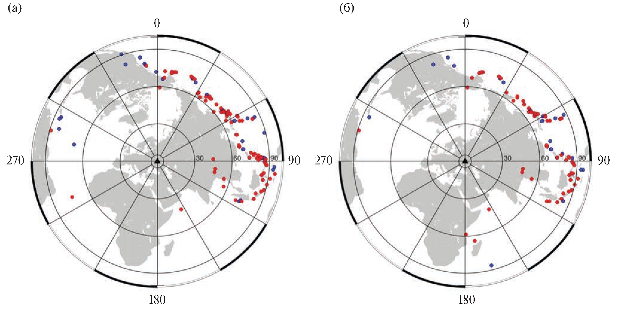 Рис. 2. Эпицентры отобранных для анализа событий по данным станции VSR (а) и VRH (б). Красными точками показаны эпицентры событий, сейсмограммы которых отобраны для расчета PRF, синими – для SRF.