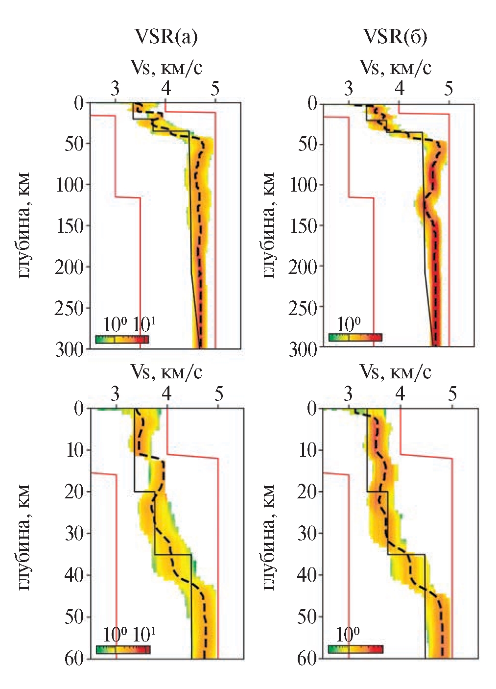 Рис. 3. Модели распределения скоростей поперечных волн с глубиной для станций VSR и VRH. Верхняя панель рисунка содержит скоростные модели литосферы, нижняя – более подробно земной коры. Цветами показаны поля сгущения индивидуальных минимизированных случайных моделей. Пунктирными линиями показаны медианные (итоговые) модели. Красные линии обозначают границы формирования случайных начальных моделей. Чёрные линии представляют референтную модель IASP91.