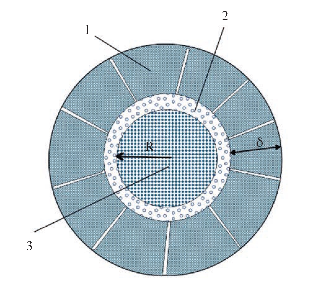 Рис. 2. Трёхслойная схема диссоциации гранулы газового гидрата: (1) – корка льда толщиной δ; (2) – тонкий слой метана, образовавшийся при разложении газогидрата; (3) – нерастворившийся гидрат метана, термодинамические условия которого соответствуют стационарному состоянию.
