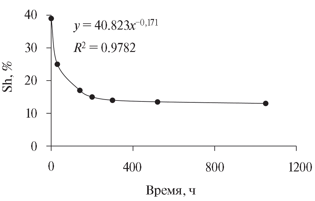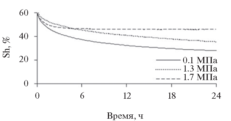 Рис. 3. Изменение во времени гидратонасыщенности (Sh) мёрзлого песка при −6°С при снижении газового давления от равновесного до 0.1 МПа.