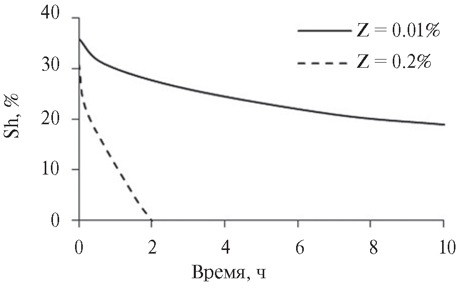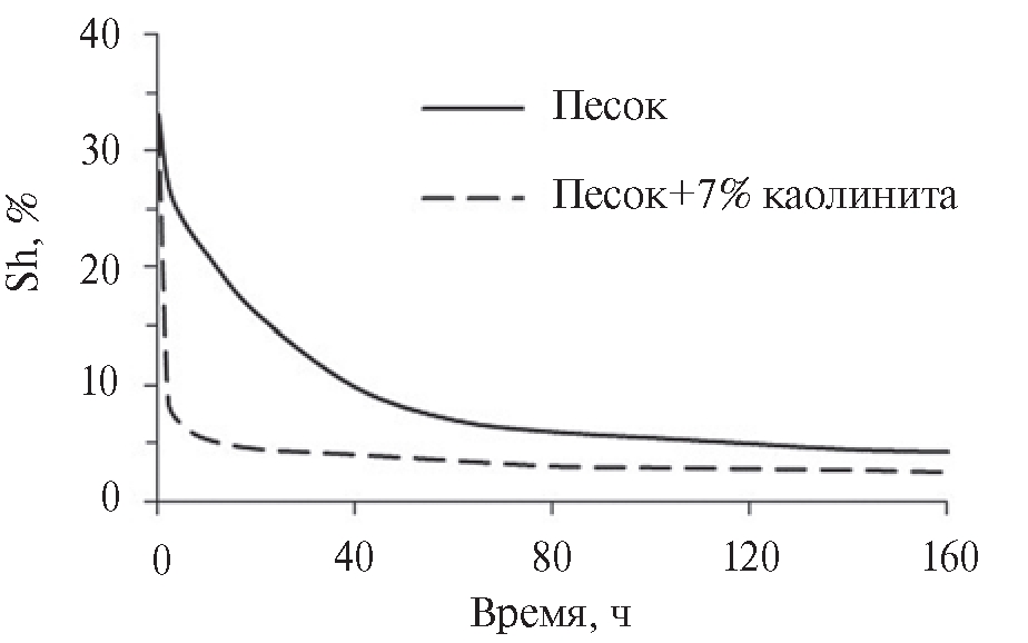 На основе аппроксимации экспериментальных данных в работе [6] (рис. 3) была предложена аналитическая зависимость остаточной гидратонасыщенности от времени в виде: