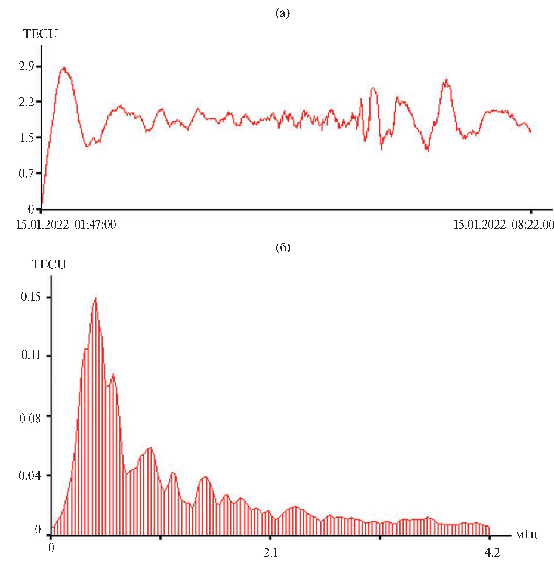 По данному рисунку можно сказать об интенсивности полного электронного содержания в ионосфере над конкретной точкой земной поверхности. На рис. 3 а приведён участок записи полного электронного содержания в ионосфере, полученный на станции BKM2 при прохождении спутника в поле видимости данной станции, а на рис. 3 б – его спектр, полученный периодограммным методом с усреднением 2. Из спектра можно выделить мощные максимумы на частотах, соответствующих периодам 39 мин 23.1 с, 29 мин 26.7 с, 17 мин 39.3 с, 14 мин 37.7 с, 11 мин 22.7 с. Эти данные относятся ко всему обработанному ряду.