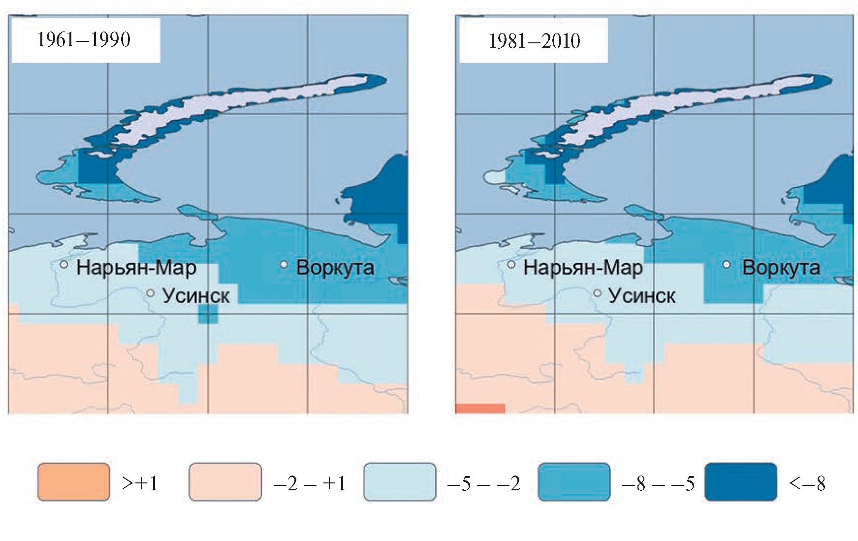 Рис. 1. Среднегодовая температура воздуха в период 1961–1990 гг. и в период 1981–2010 гг. по данным реанализа 20CRv3.