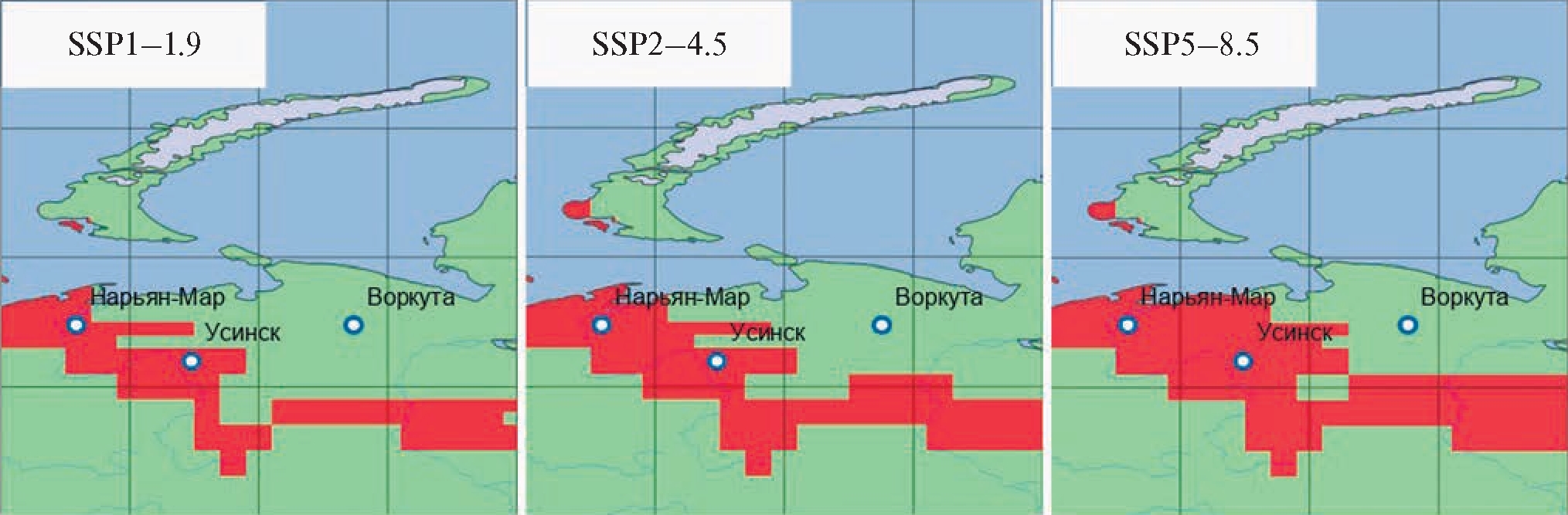 Повышение СГТ даже на 1°C уже может привести к переходу через –2°C в тех районах Большеземельской тундры, где она была выше –3°C в период 1981–2010 гг. На рис. 2 показаны районы, где можно ожидать переход СГТ через –2°C в период 2031–2060 гг. при прогностических оценках изменения СГТ для сценария SSP2-4.5, соответствующего современным тенденциям изменения выбросов углекислого газа в атмосферу, а также для “супер-зелёного” (SSP1-1.9) и для “супер-углеродного” (SSP5-8.5) сценария развития мировой экономики [17].