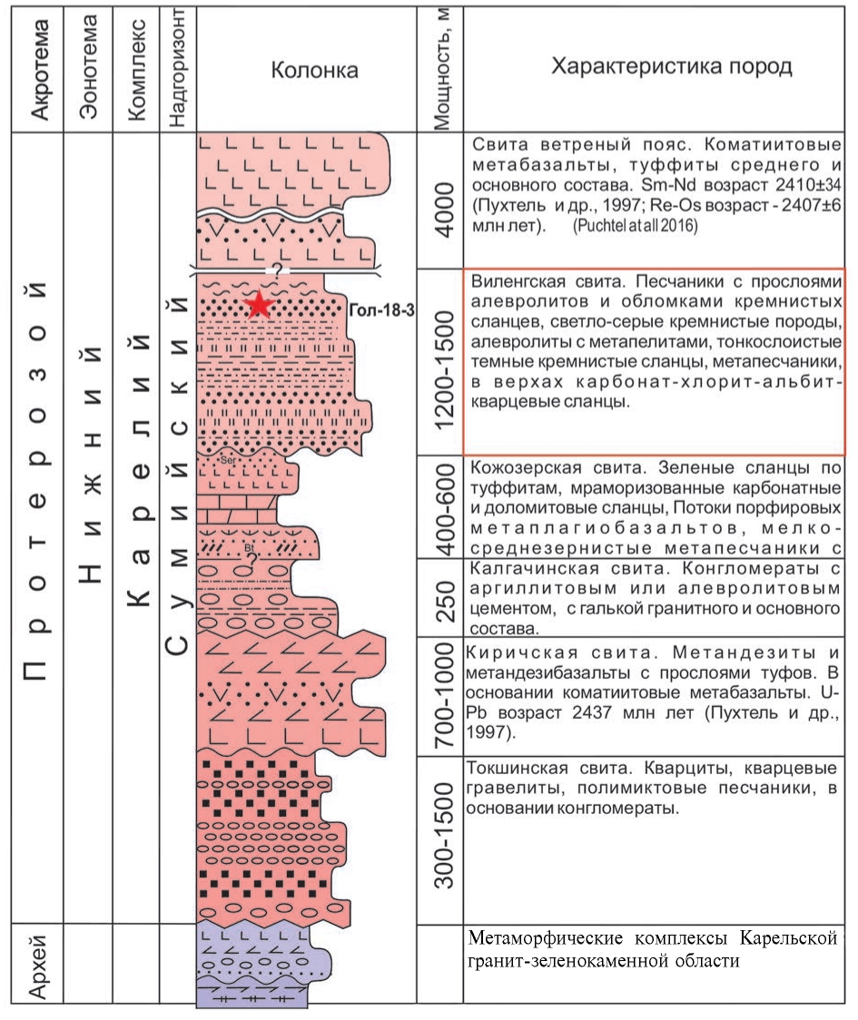 Ветреный пояс является рифтогенной структурой раннепротерозойского возраста и несёт в себе важную информацию об эволюции геодинамических условий восточной части Кольско-Карельского палеоконтинента. В настоящее время остаются дискуссионными вопросы стратиграфии Ветреного пояса, в частности возраст и условия формирования виленгской свиты. Так, согласно [4], породы свиты относятся к людиковийскому надгоризонту палеопротерозоя, однако принимая во внимание надёжный изотопный возраст перекрывающих коматиитовых базальтов 2407±6 млн лет [3], более молодой возраст метапесчаников может быть только при условии их аллохтонного залегания.