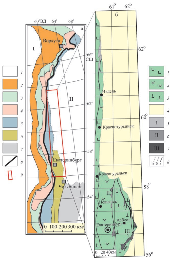 Рис. 1. Расположение главных структур Урала (а) и схематическая геологическая карта района распространения нижнекаменноугольных толщ на восточном склоне Среднего и Северного Урала (б). а: 1 – осадочный чехол платформ: Восточно-Европейской (I) и Западно-Сибирской (II); 2–4 – палеоконтинентальный сектор Урала: 2 – Предуральский краевой прогиб, 3 – Западно-Уральская мегазона (палеозойские комплексы пассивной континентальной окраины и континентального склона), 4 – Центрально-Уральская мегазона (докембрийские образования); 5–7 – палеоокеанический сектор Урала: 5 – Магнитогорская, Тагильская и Войкаро-Щучьинская мегазоны (палеозойские преимущественно островодужные образования), 6 – Восточно-Уральская мегазона, 7 – Зауральская мегазона (палеозойские и докембрийские комплексы); 8 – Главный Уральский разлом; 9 – исследуемый район; б: 1 – позднеордовикско-девонские островодужные комплексы Тагильской мегазоны; 2–3 – Восточно-Уральская структурно-формационная мегазона (районирование по [4]), 2 – Верхотурско-Новооренбургская структурно-формационная зона (СФЗ), 3 – Алапаевско-Адамовская СФЗ; 4 – мезозойско-кайнозойские толщи чехла Западно-Сибирской платформы; 5–7 – нижнекаменноугольные образования: 5 – косьинская и медногорская свиты, апсинская и песчано-известняковая толщи; 6 – арамильская, кореловская, терригенно-карбонатная и карбонатно-терригенная толщи; 7 – известняковая толща, бекленищевская, исетская и щербаковская свиты; 8 – интрузивные и стратиграфические границы (а), взбросы и надвиги (б), разрывные нарушения со сложной и неустановленной кинематикой (в).