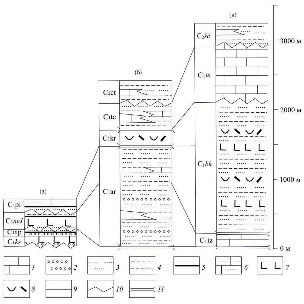 Рис. 2. Литолого-стратиграфические колонки нижнекаменноугольных толщ из разных структур восточного склона Среднего и Северного Урала: (а) – Сосьвинско-Лозьвинского грабена в пределах Тагильской мегазоны (I на рис. 1); б и в – в зонах региональных разломов Восточно-Уральской мегазоны: (б) – Мурзинского (II на рис. 1), (в) – Алапаевско-Челябинского (III на рис. 1). Индексы стратонов расшифрованы в тексте. 1 – известняки; 2 – конгломераты и гравелиты; 3 – песчаники; 4 – алевролиты, аргиллиты и глинистые сланцы; 5 – каменные угли; 6 – глинистые известняки и мергели; 7 – базальты и андезибазальты; 8 – риолиты, дациты и их туфы; 9 – стратиграфические границы; 10 – несогласия; 11 – тектонические границы.