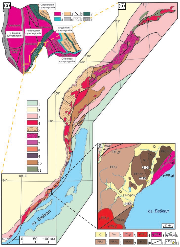 Одним из примеров рассмотренной выше ситуации является южный фланг Сибирского кратона, где широко представлены докембрийские магматические и метаморфические комплексы. Как известно, Сибирский кратон (фундамент Сибирской платформы) был сформирован в раннем протерозое в результате объединения архейских и раннепротерозойских террейнов в единую структуру [1, 2]. Ключевыми элементами структуры Сибирского кратона являются раннепротерозойские орогенные пояса и шовные зоны [1, 3], одним из которых является Акитканский орогенный пояс, разделяющий Анабарский и Алданский супертеррейны (рис. 1 а) [1, 3]. Акитканский орогенный пояс представляет собой гетерогенную структуру, в пределах которой выделяются четыре основные региональные тектонические зоны (Голоустенская, Сарминская, Чуйская и Тонодская) (рис. 1 а, б), отличающиеся друг от друга возрастом и составами метаморфических и магматических пород, степенью метаморфической переработки и геодинамическими условиями образования [3]. Объединение этих пород в единую структуру и, соответственно, формирование Акитканского орогенного пояса имело место на интервале 1.95–2.00 млрд лет [3, 4], а его дальнейшая эволюция маркируется внедрением магматических пород Южно-Сибирского постколлизионного магматического пояса с возрастом 1.84–1.88 млрд лет [5]. Практически на протяжении всей истории изучения Акитканского орогенного пояса выводы об эволюции этого пояса были сделаны лишь на основе данных по времени проявления основных магматических и метаморфических событий [3]. В то же время в каждой зоне Акитканского пояса выделяются стратоподразделения, объединяющие в своем строении метаморфизованные осадочные и вулканогенно-осадочные толщи (рис. 1 б). По мнению авторов, именно детальное изучение пород этих стратоподразделений позволит восполнить пробелы в расшифровке истории эволюции отдельных докембрийских блоков, вовлечённых в структуру Акитканского орогенного пояса.