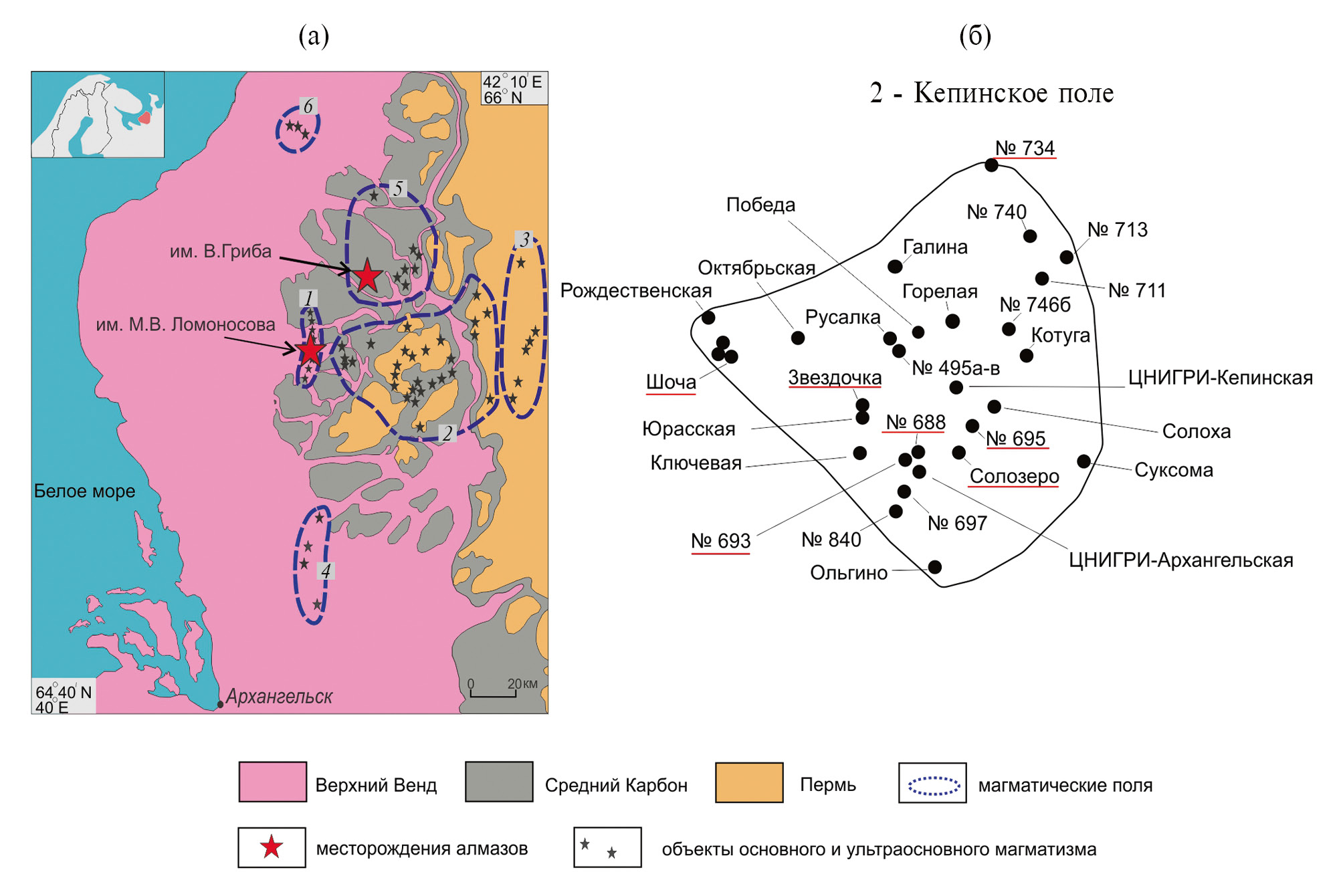Рис. 1. Схема расположения магматических объектов Архангельской алмазоносной провинции (а) с детализацией [6] для Кепинского поля (б). 1–6 – магматические поля (по [1]): 1 – Золотицкое, 2 – Кепинское, 3 – Турьинское, 4 – Ижмозерское, 5 – Верхотинское, 6 – Мельское. Красной линией подчеркнуты кимберлитовые объекты Кепинского поля, для которых ранее были получены данные по составу Rb–Sr- и Sm–Nd-изотопных систем [1–4].