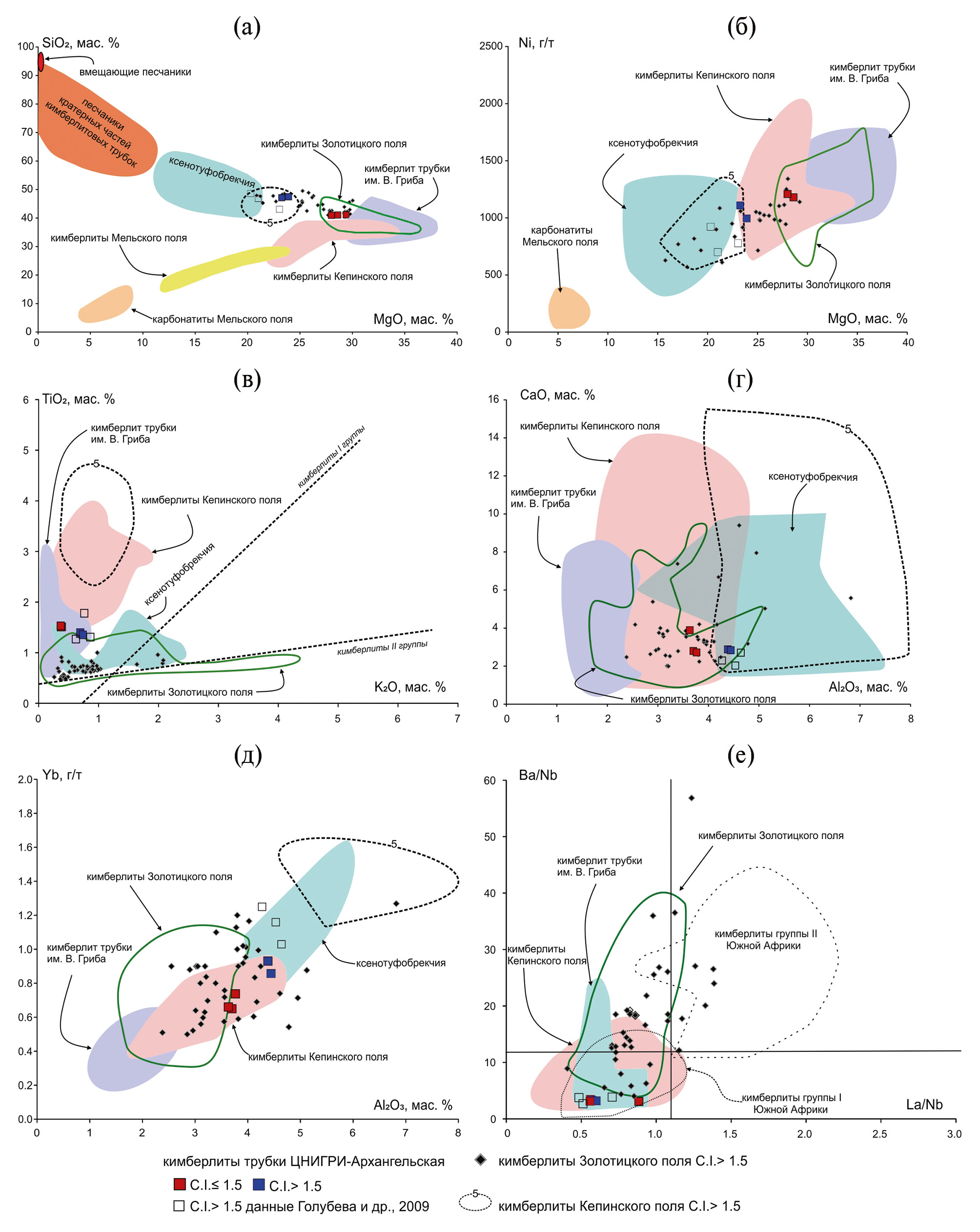 Рис. 4. Особенности валового состава кимберлитов трубки ЦНИГРИ-Архангельская в распределении SiO2/MgO (а), Ni/MgO (б), TiO2/K2O (в), CaO/Al2O3 (г), Yb/Al2O3 (д), Ba/Nb-La/Yb (е). Поля составов кимберлитов трубок им. В. Гриба, Золотицкого и Кепинского полей включают только составы образцов, для которых рассчитанный индекс контаминации (C.I. [14]) <1.5. Составы пород [1-4, 16]. Поля составов кимберлитов I- и II-групп [5].
