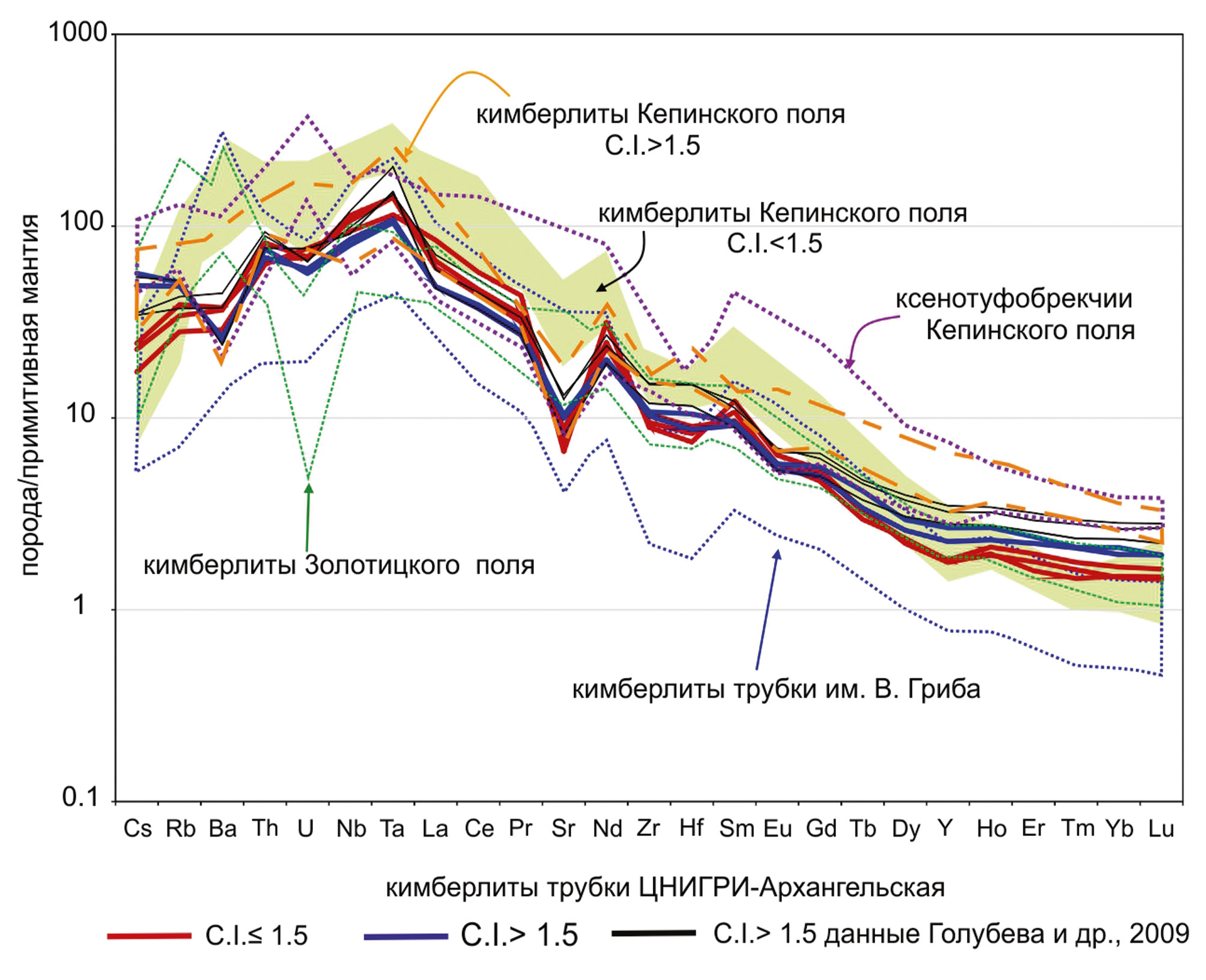 Рис. 5. Нормированные на примитивную мантию [15] концентрации редких элементов в кимберлитах трубки ЦНИГРИ-Архангельская. Составы кимберлитов для Золотицкого поля и трубки им. В. Гриба показаны только для образцов с C.I. ≤1.5. Данные по составам пород Золотицкого и Кепинского полей и трубки им. В. Гриба [1–4, 16].