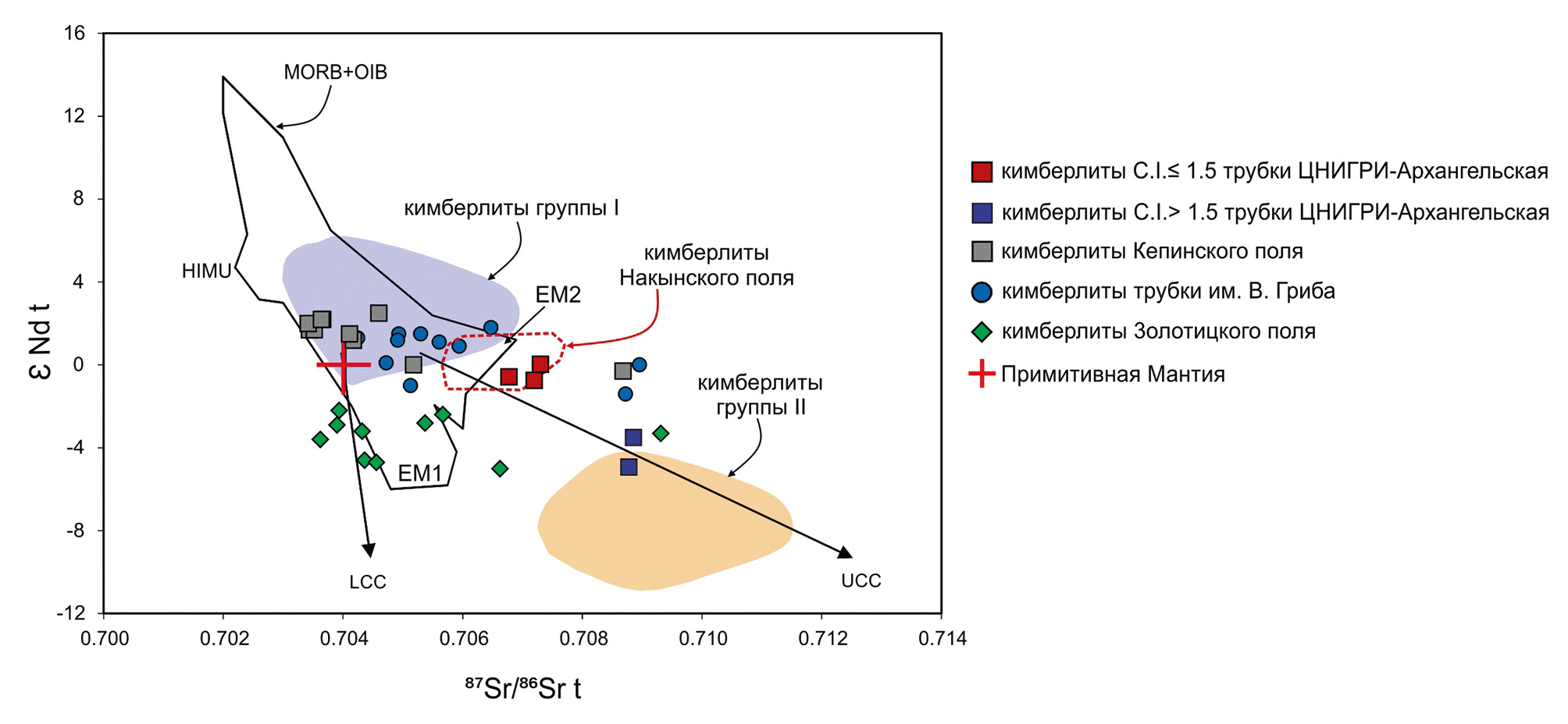 Рис. 6. Изотопный состав Sr и Nd кимберлитов трубки ЦНИГРИ-Архангельская. Данные по кимберлитам Золотицкого и Кепинского полей и трубки им. В. Гриба [1–4]. Поля кимберлитов I- и II-групп [5]; примитивная мантия [12]; MORB, OIB, EM1, EM2 [17]; кимберлиты Накынского поля [18].