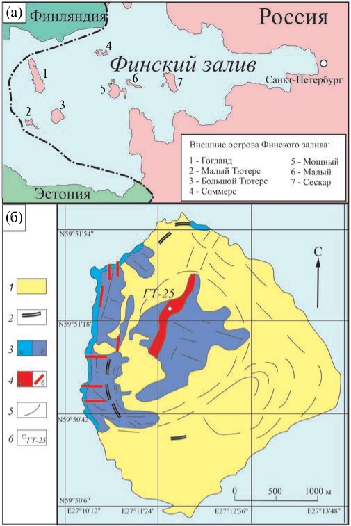 Рис. 1. Упрощённая геологическая карта о-ва Большой Тютерс: (а) положение среди Внешних островов Финского залива; (б) карта острова с указанием места отбора пробы ГТ-25 (1 – четвертичные отложения, пески, реже морена; 2 – поднятый пляж; 3 – вторичные кварциты: в береговых скалах (а), обнажения в лесу (б); 4 – граниты: а – массив, б – дайки; 5 – структурные элементы ; положение пробы ГТ-25).