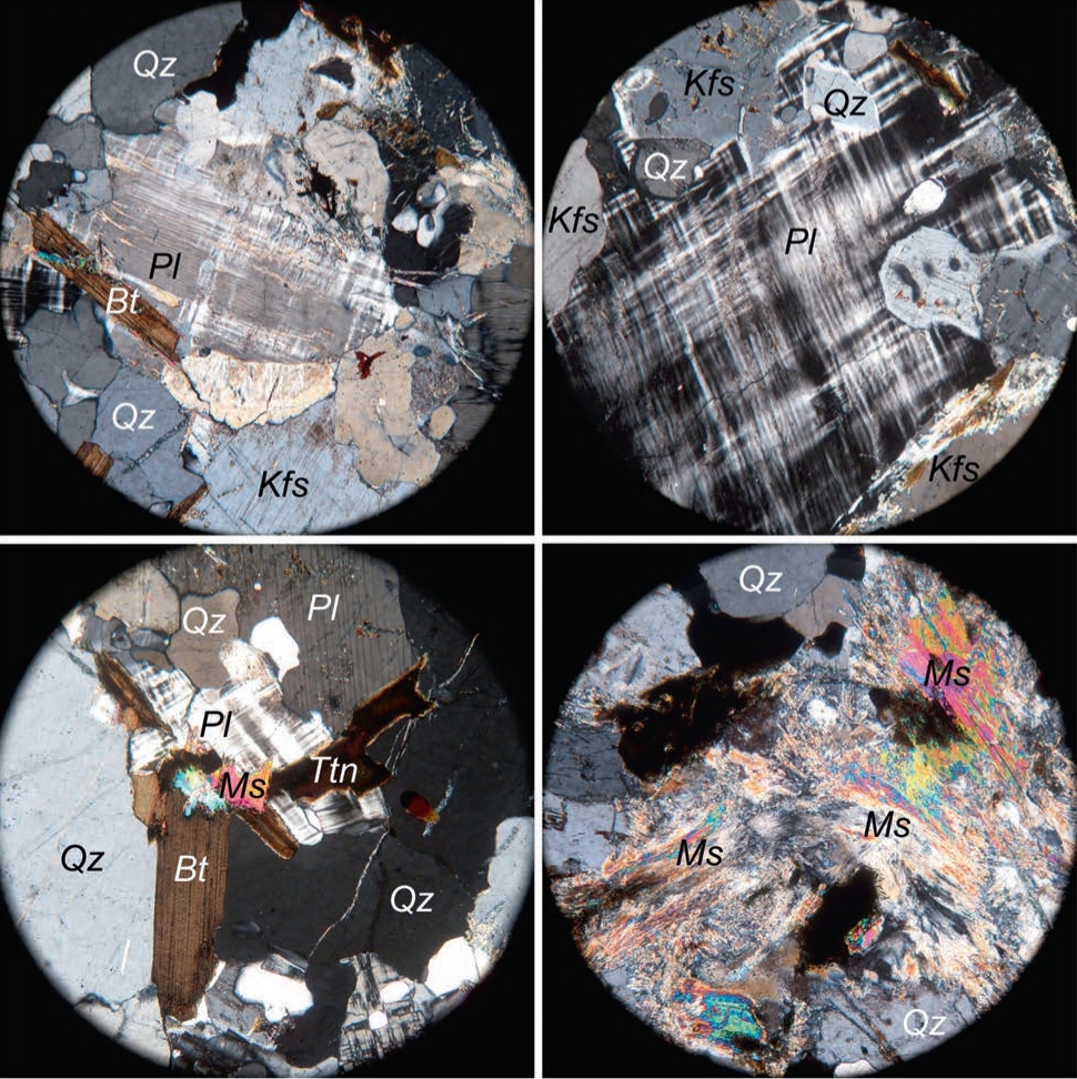 Рис. 2. Изображения шлифа гранита ГТ-25 в поляризационном микроскопе (с анализатором, увеличение 10, размер поля зрения 4 мм). Обозначения минералов: Qz – кварц, Pl – плагиоклаз, Kfs – калиевый полевой шпат, Bt – биотит, Ms – мусковит, Ttn – титанит.