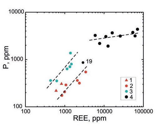 Точки циркона, расположенные в нижней части дискордии (группа 4 на рис. 6), обособлены от других точек на диаграмме, демонстрирующей соотношение REE и P. Для них установлено повышенное содержание этих элементов с положительной корреляцией, обусловленной совместным вхождением в структуру циркона. При этом для точек этой группы рост содержания REE существенно превышает увеличение содержания Р (отношение REE/P для 9 точек, кроме точки 19, составляет в среднем 8.7). Для точек, образующих субконкордантный кластер (группа 2), характерны пониженные содержания REE и P и более умеренные соотношения этих элементов (REE/P составляет в среднем 5.5). Точка 19, расположенная примерно в середине дискордии, по геохимическим характеристикам тяготеет к этой группе, как и точки 11 и 12 (группа 1, захваченный циркон архейского возраста). Точки, смещённые вниз от верхнего пересечения дискордии с конкордией (группа 3), по сравнению с группами 1 и 2, охарактиризованы более высоким содержанием Р при сопоставимом уровне содержания REE (отношение REE/Р составляет в среднем 1.6).