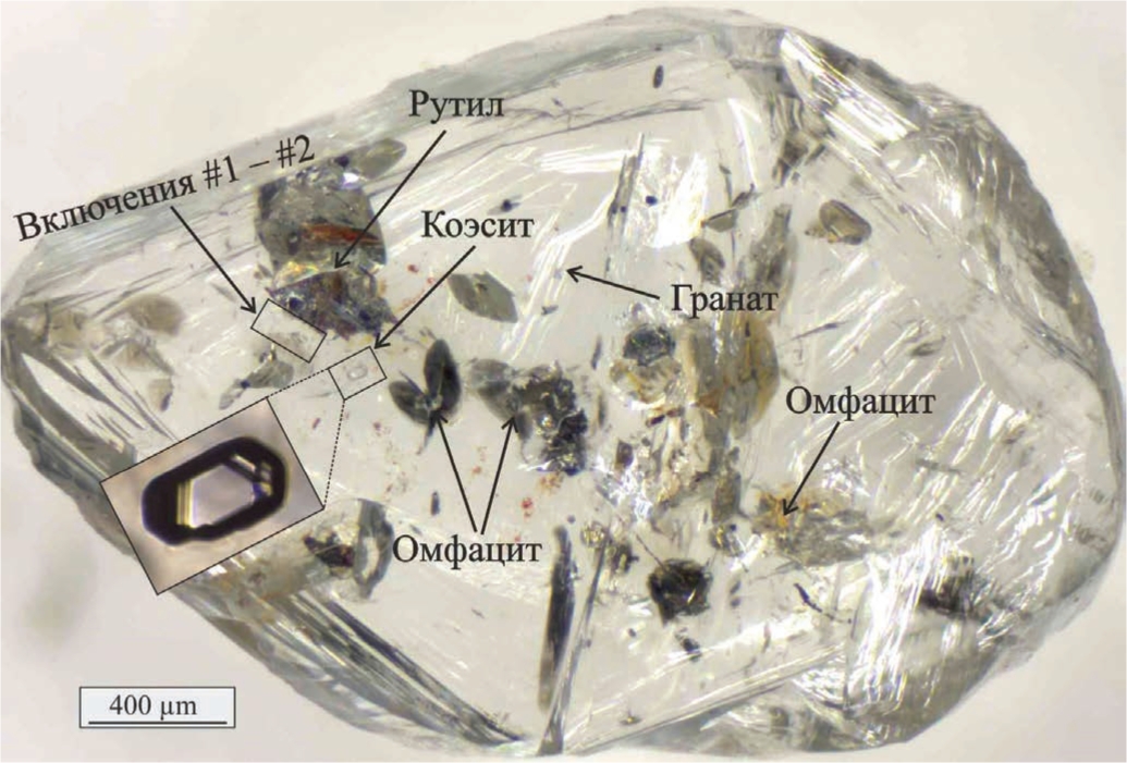 Многолетние исследования позволили выявить и подтвердить существование двух основных типов материнского субстрата для кристаллизации включений, диагностируемых в кристаллах алмазах: Р-тип – перидотитовый (оливин, ортопироксен, клинопироксен, хромит) и Е-тип – эклогитовый (коэсит, омфацит, гроссуляр-альмандиновый гранат, кианит, рутил). Коэсит – высокобарическая полиморфная модификация SiO2 – является типичным минералом эклогитового парагенезиса [1, 2] и свидетельствует о субдукционной природе протолита [3].