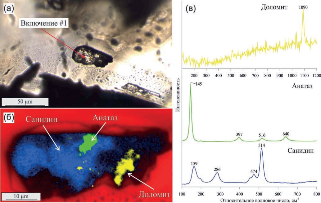 Рис. 3. Трёхфазное включение #1 в кристалле алмаза Vn-65. (а) фотография в проходящем свете; (б) КР-карта, демонстрирующая минеральный состав включения (цвета соответствуют спектрам на рисунке в); (в) КР-спектры минералов, идентифицированных во включении #1.