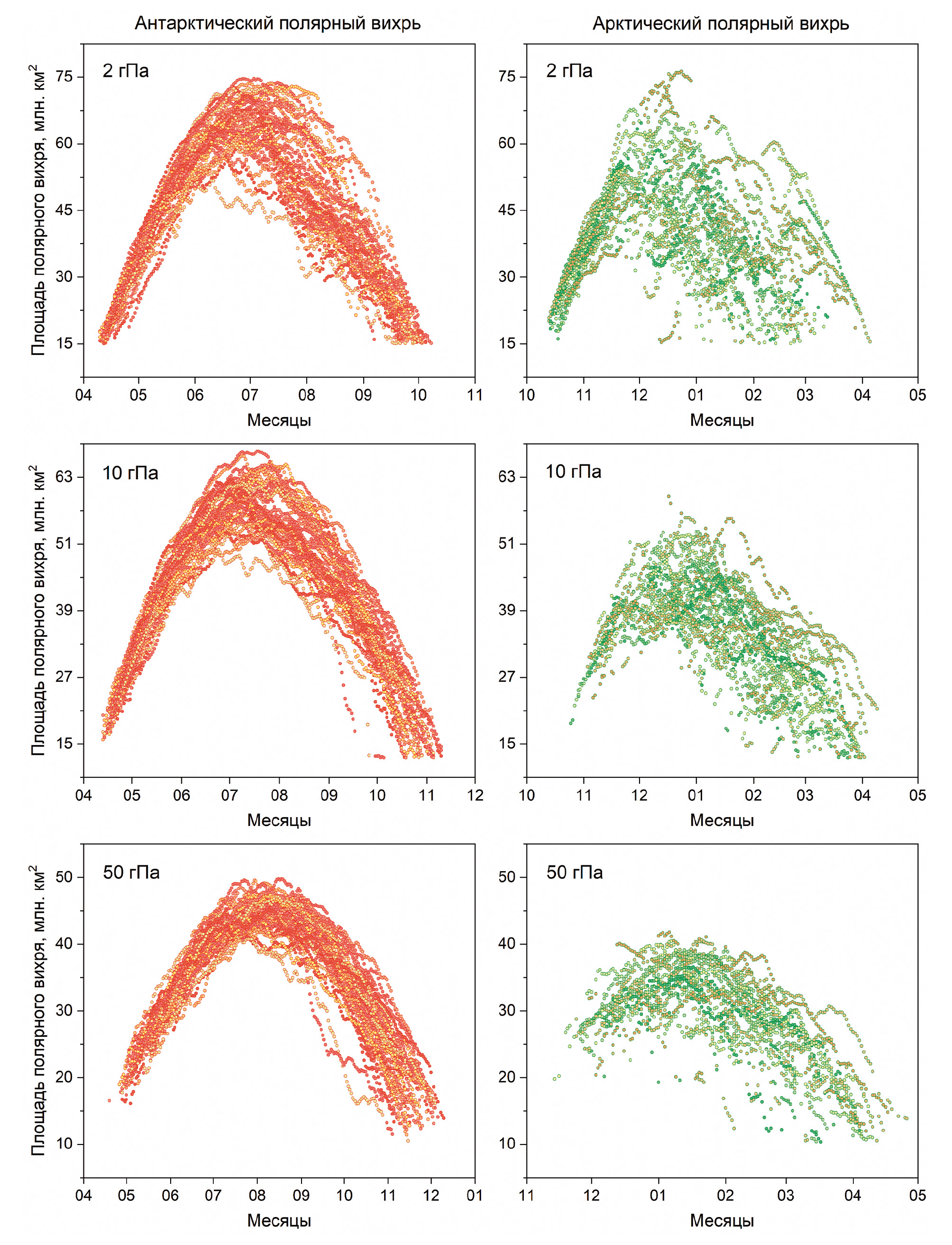 Рис. 1. Внутригодовые среднесуточные изменения площади антарктического и арктического полярных вихрей на уровнях 2, 10 и 50 гПа с 1979 по 2021 гг.