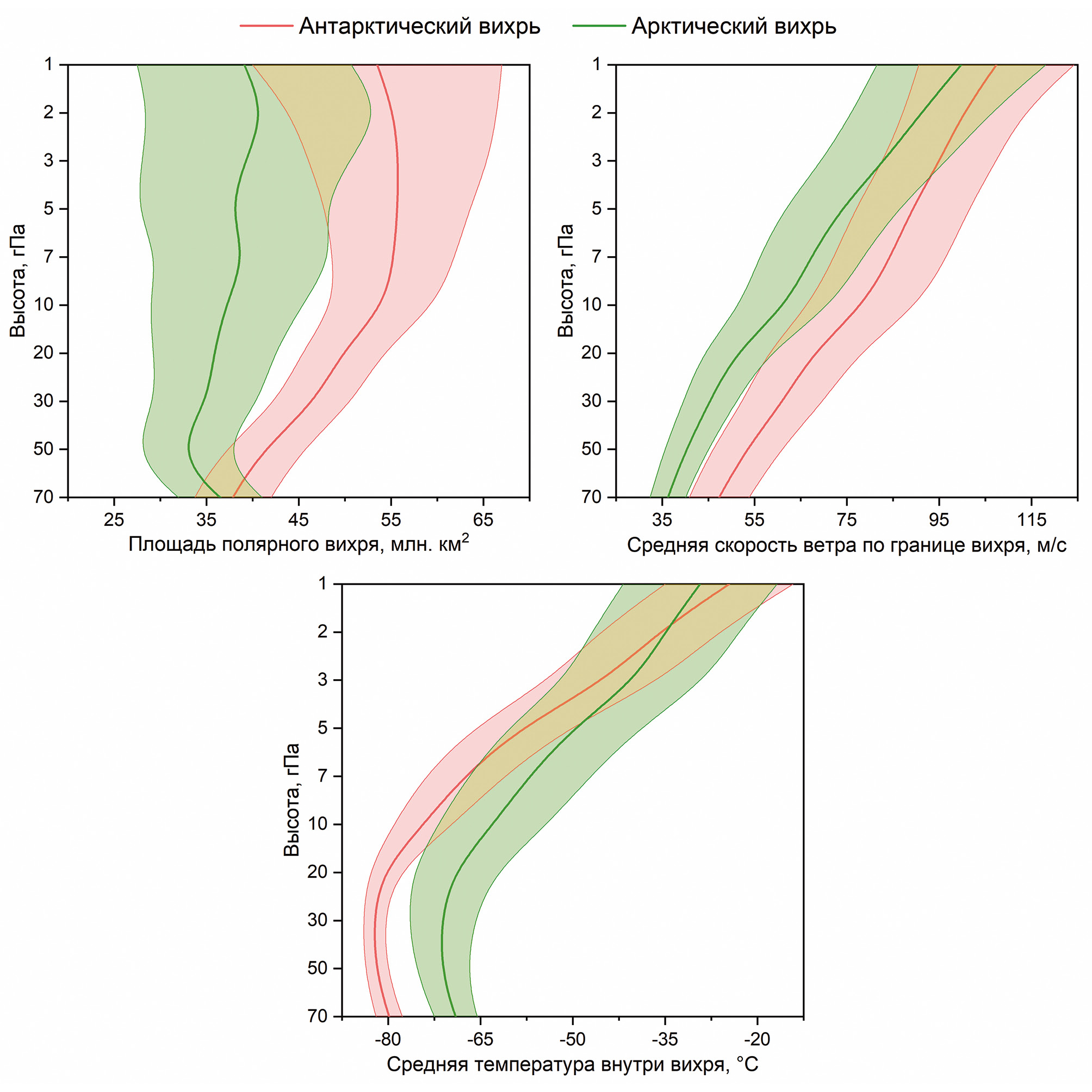 Рис. 6. Усреднённые за зимний период 1979–2021 гг. значения площади полярного вихря, средней скорости ветра по границе вихря и средней температуры внутри вихря на уровнях от 70 до 1 гПа для антарктического и арктического полярных вихрей с СКО.