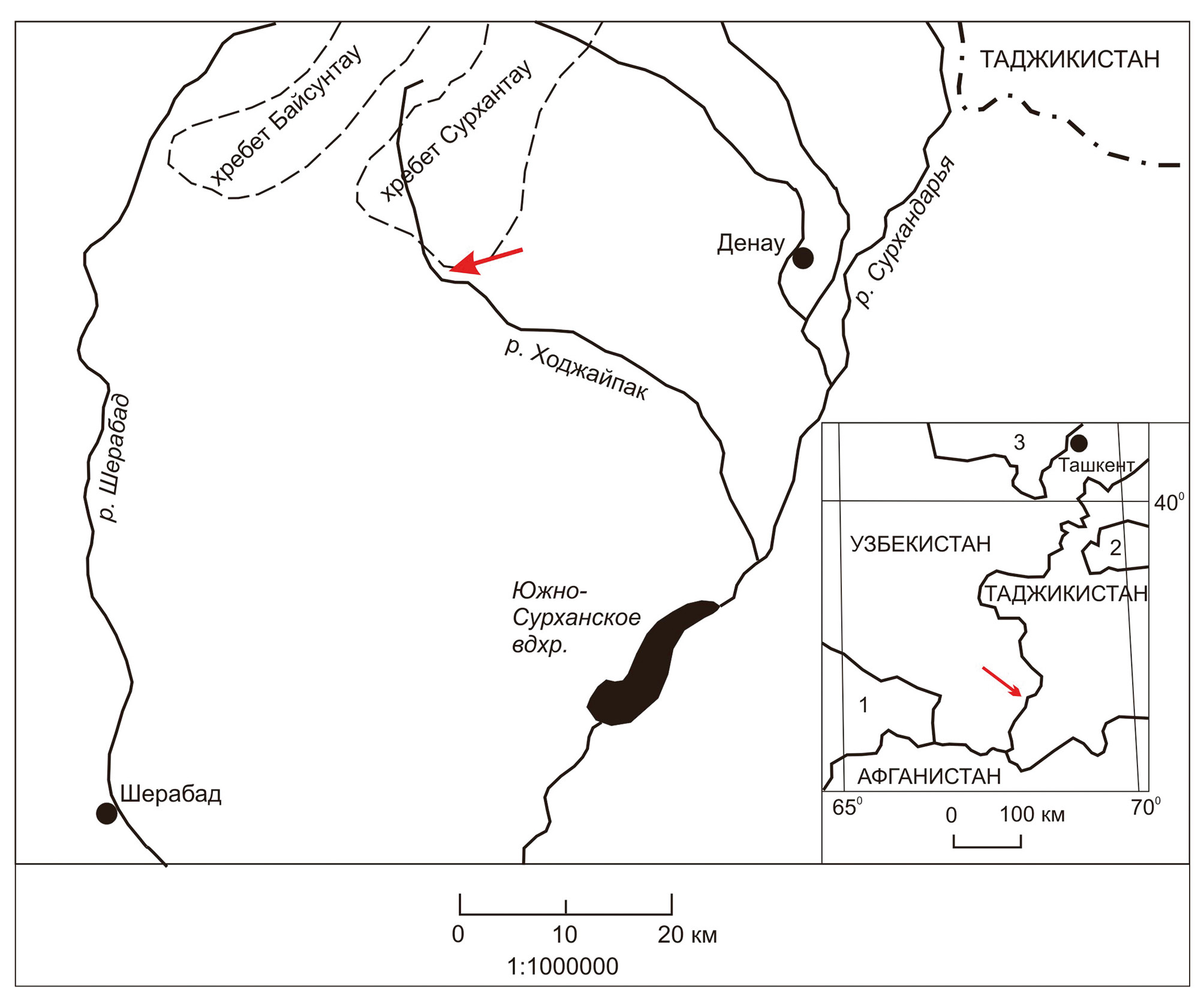 Рис. 1. Географическое положение пещеры Ходжайпак (указана красной стрелкой). На врезке справа цифрами отмечены Туркменистан (1), Кыргызстан (2) и Казахстан (3).