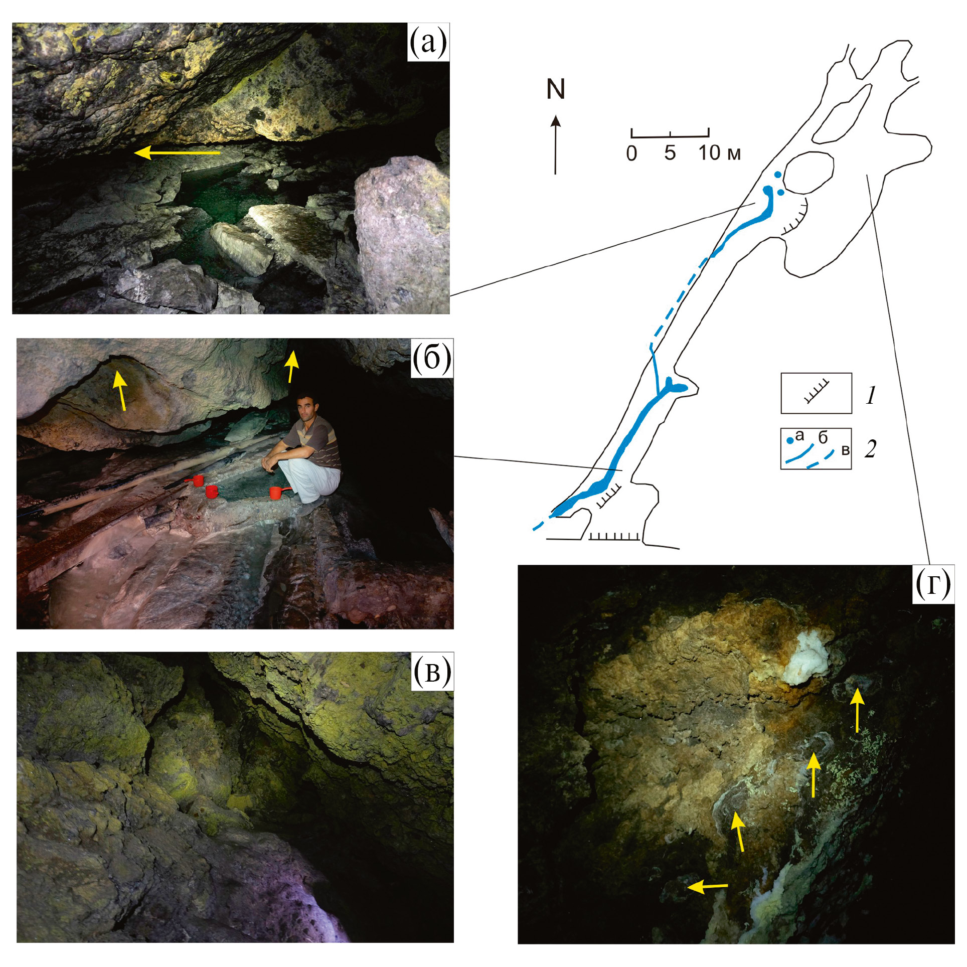 Рис. 2. Схема пещеры и её морфологические особенности: выемки на стенах, образовавшиеся на границе вода‒воздух при понижении уровня грунтовых вод (а); коррозионная морфология потолка пещеры над подземной рекой (коррозионные куполообразные выемки показаны стрелками) (б); общий вид пещерного хода, где видны коры замещающего гипса на стенах, а мощные рыхлые гипсовые отложения покрывают пол (зеленоватый цвет вызван налётами серы) (в); участок стены, покрытый замещающим гипсом, стрелками показаны карманы, образовавшиеся при опадании кусков гипса, видны участки белоснежного перекристаллизованного гипса и желтовато-зелёные налёты серы (г).