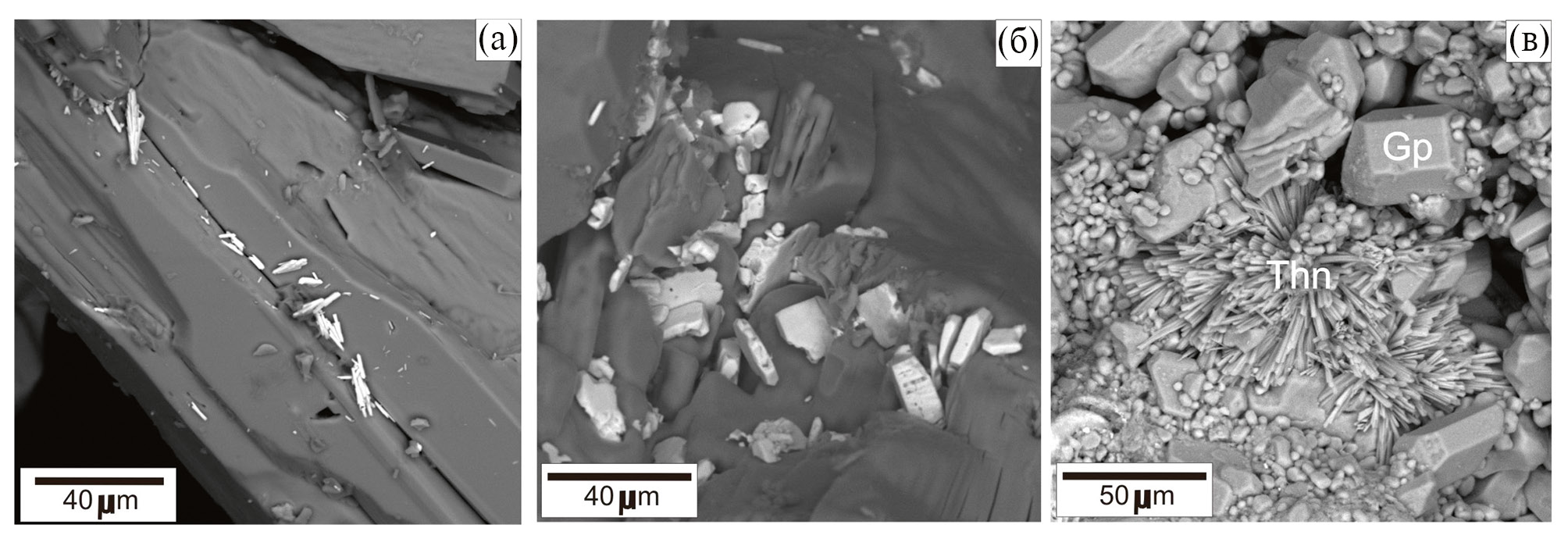Рис. 3. Игольчатые кристаллы целестина (а) и пластинчатые кристаллы барита (б) на поверхности гипсовых кристаллов (Gp), звездообразные сростки кристаллов тенардита (Thn) среди гипсовых (Gp) кристаллов (в).