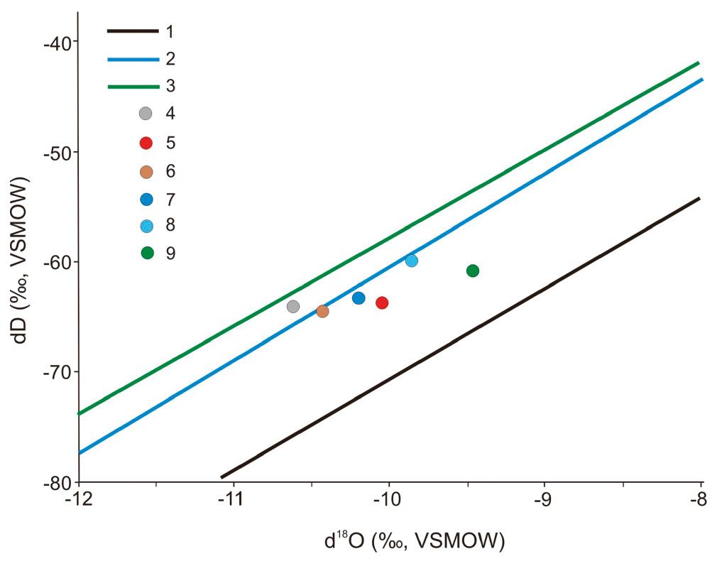 Рис. 4. Изотопный состав подземных вод района хребта Сурхантау. 1 ‒ глобальная линия метеорных вод (GMWL) по [17], 2–3 ‒ локальная линия метеорных вод (LMWL) (2) и метеорные воды Восточного Средиземноморья (EMWL) (3) по [18]; 4–8 – пресные карстовые воды хребта Сурхантау: 4 – источник, вытекающий из пещеры Бой-Булок, 5 – озеро в пещере Лунная, 6 – источник в Большом Каньоне, 7 – ручей в пещере имени Вишневского на глубине 200 м, 8 – капающая вода в пещере имени Вишневского на глубине 60 м; 9 – источник в пещере Ходжайпак.