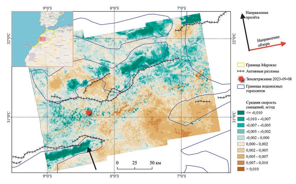 На рис. 1 представлены результаты расчётов поля средних скоростей смещений, выполненных с использованием метода Stacking-InSAR по временному ряду интерферометрических данных (801 интерферограмма) за период времени с 3 января 2019 г. по 3 сентября 2023 г. Цветовой клин характеризует скорости смещений соответствующих пикселов вдоль направления на радиолокатор Sentinel-1A/B. Соответственно положительные величины характеризуют направление смещений в сторону спутника, включая поднятие геоблоков, а отрицательные характеризуют направление от спутникового радиолокатора, в том числе опускание поверхности. Звёздочкой красного цвета обозначено расположение эпицентра землетрясения с магнитудой Mw = 6.8, происходившего на территории Марокко 8 сентября 2023 г. Синими линиями показаны контуры подземных водоносных слоёв [14].